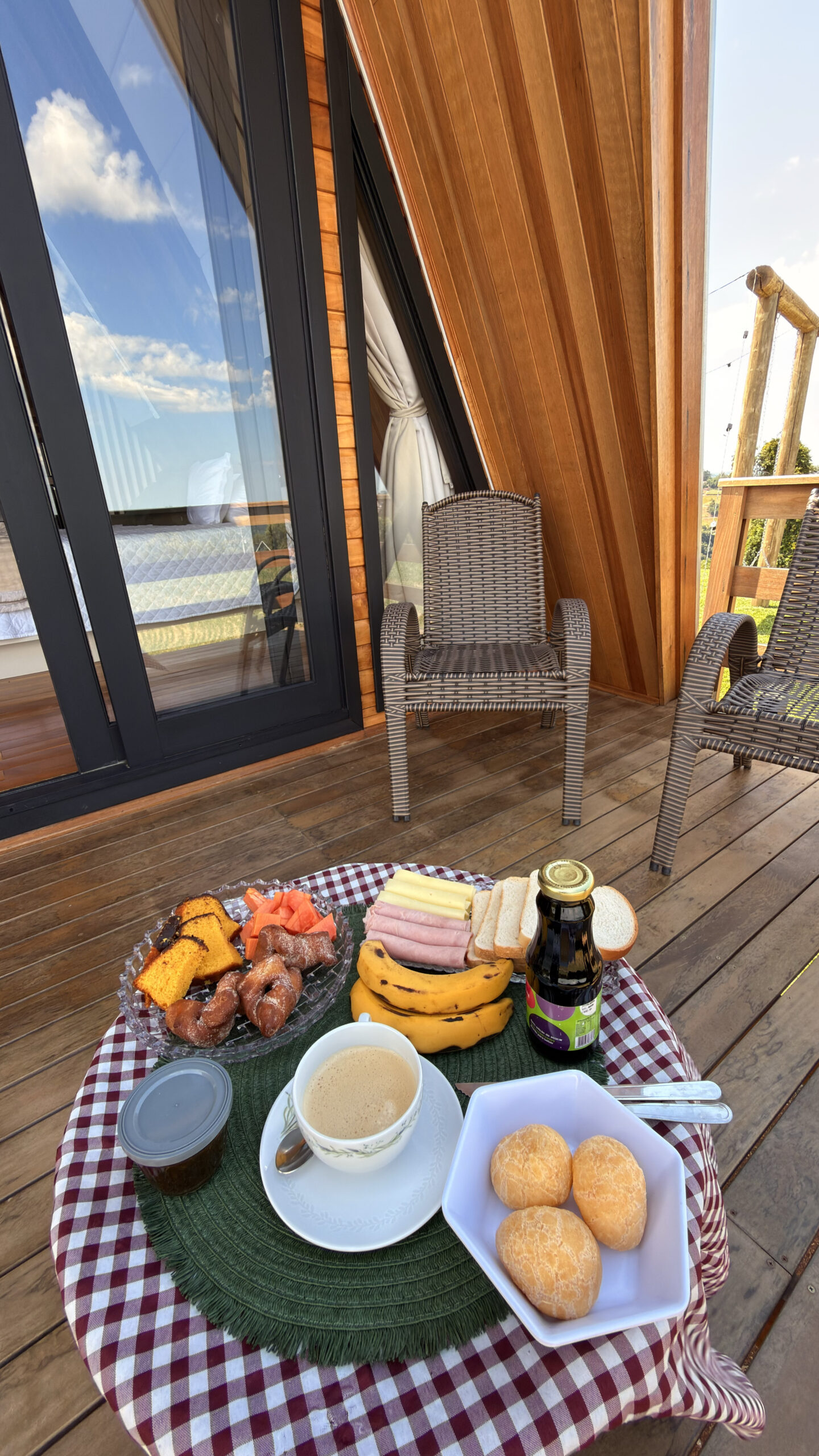 - Para deixar a estadia ainda mais especial, uma cesta de café da manhã está inclusa na diária e também um espumante bem gelado.