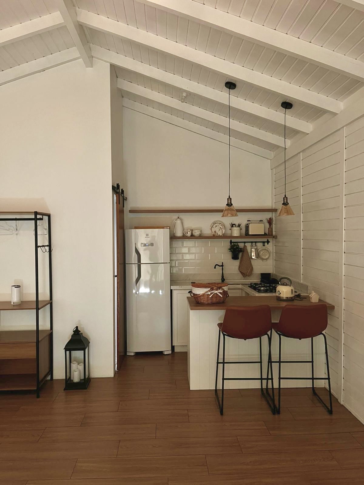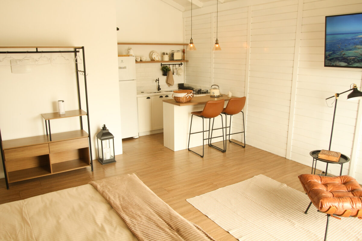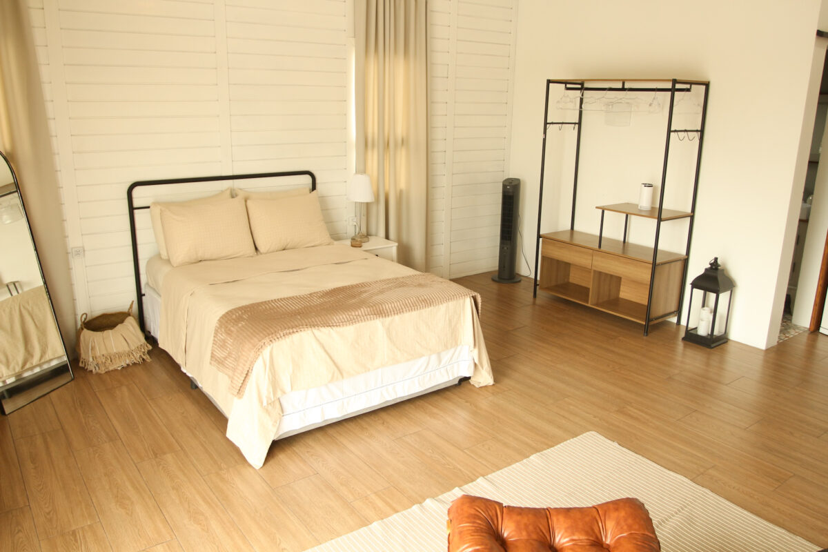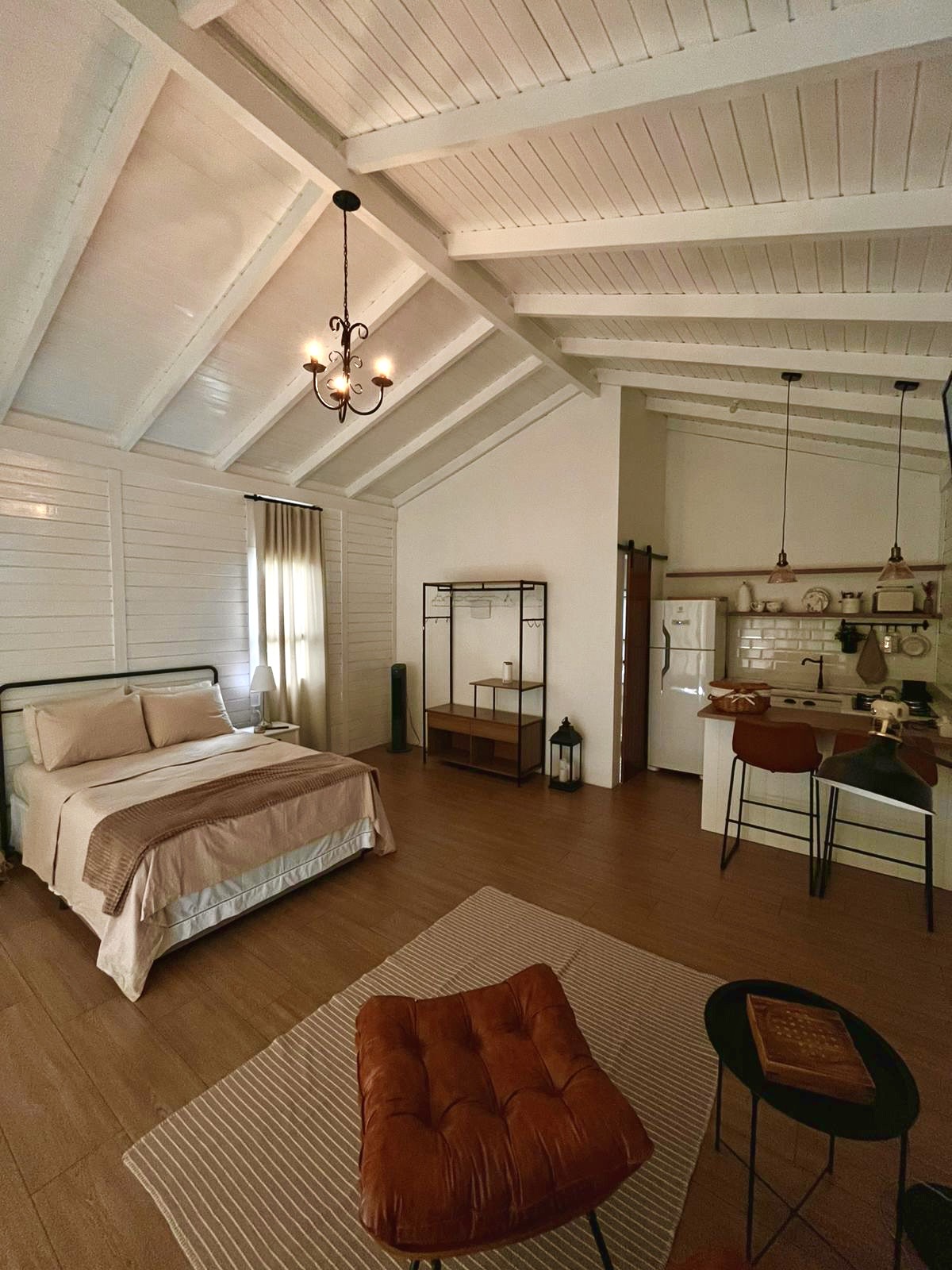 Todo o ambiente interno é aconchegante, com tons claros, detalhes em madeira e uma atmosfera acolhedora. O quarto conta com cama de casal com enxoval completo, cortinas blackout, aquecedor, espaço para itens pessoais, Smart TV 50′ e uma poltrona.