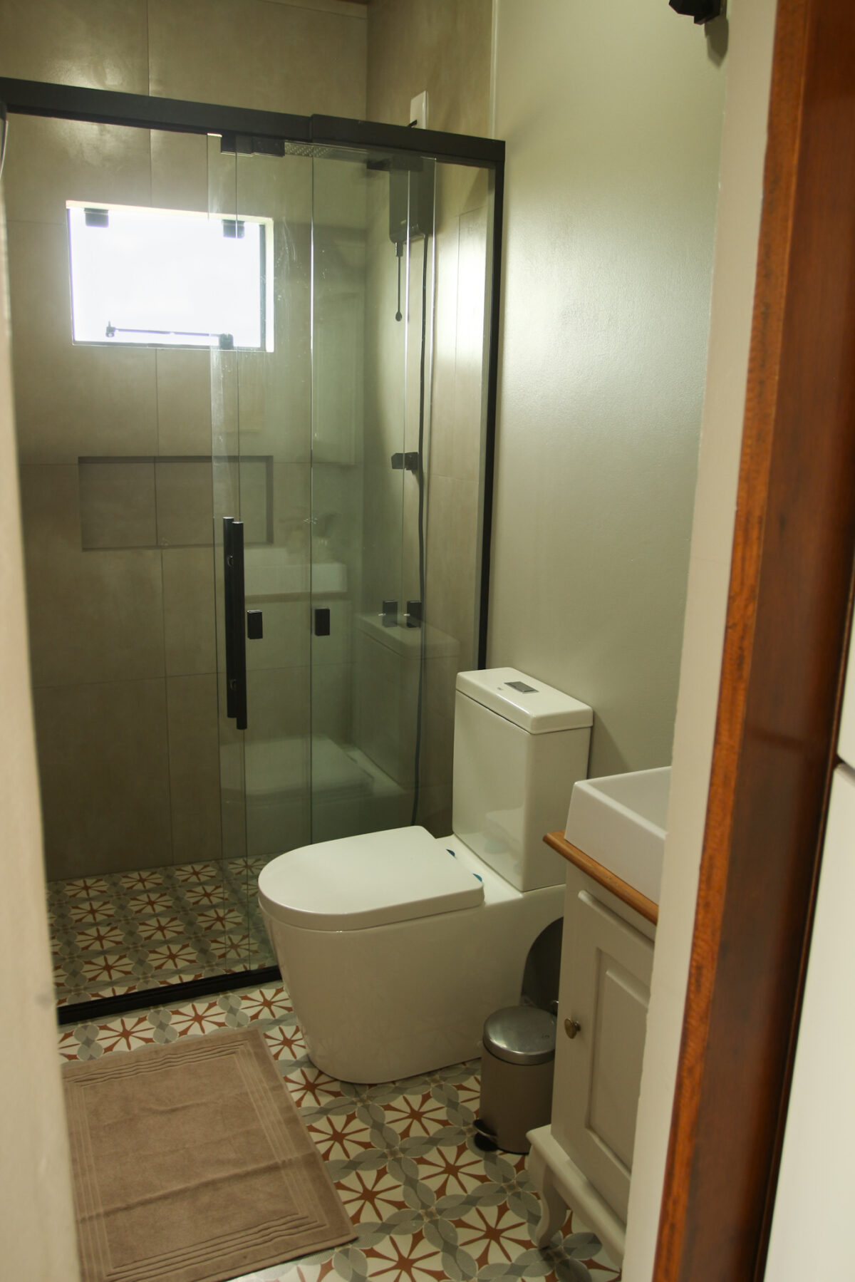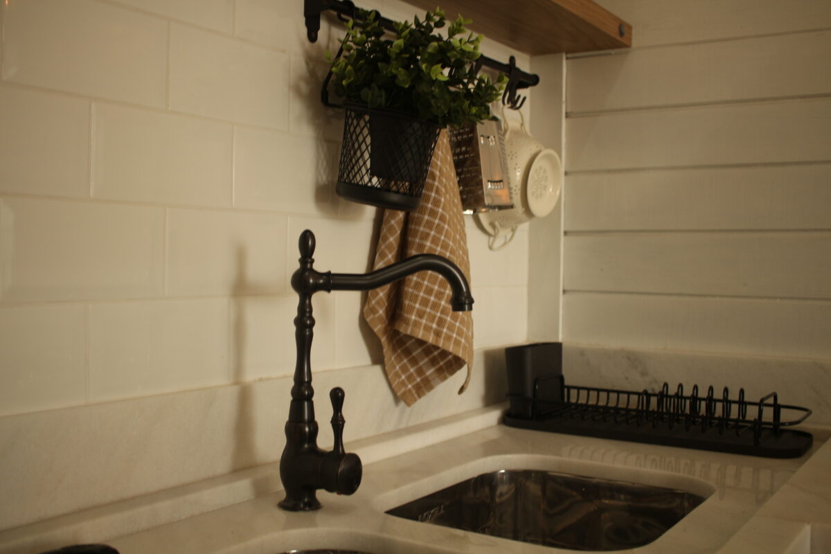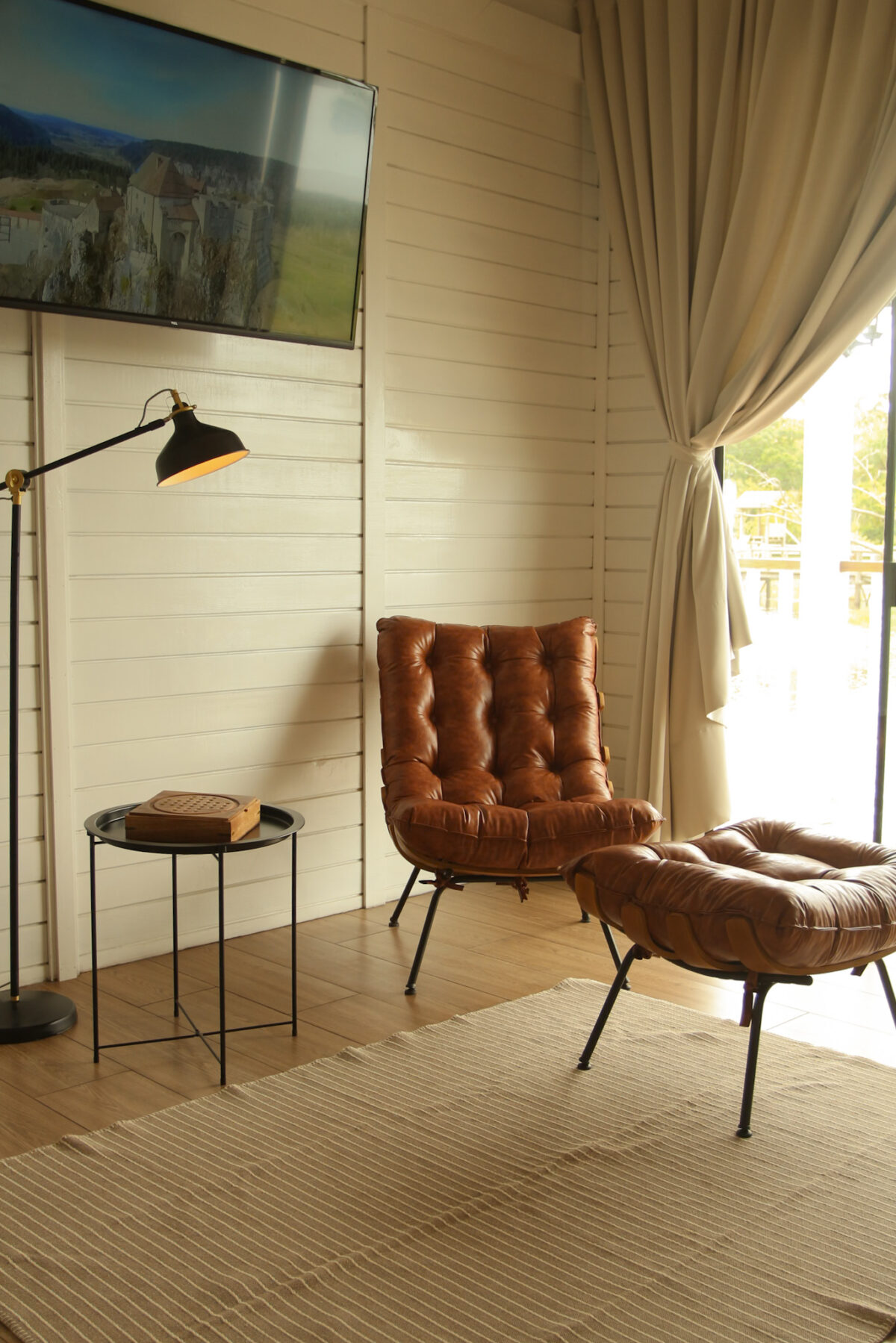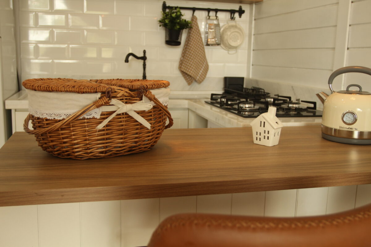 Todo o ambiente interno é aconchegante, com tons claros, detalhes em madeira e uma atmosfera acolhedora. O quarto conta com cama de casal com enxoval completo, cortinas blackout, aquecedor, espaço para itens pessoais, Smart TV 50′ e uma poltrona.