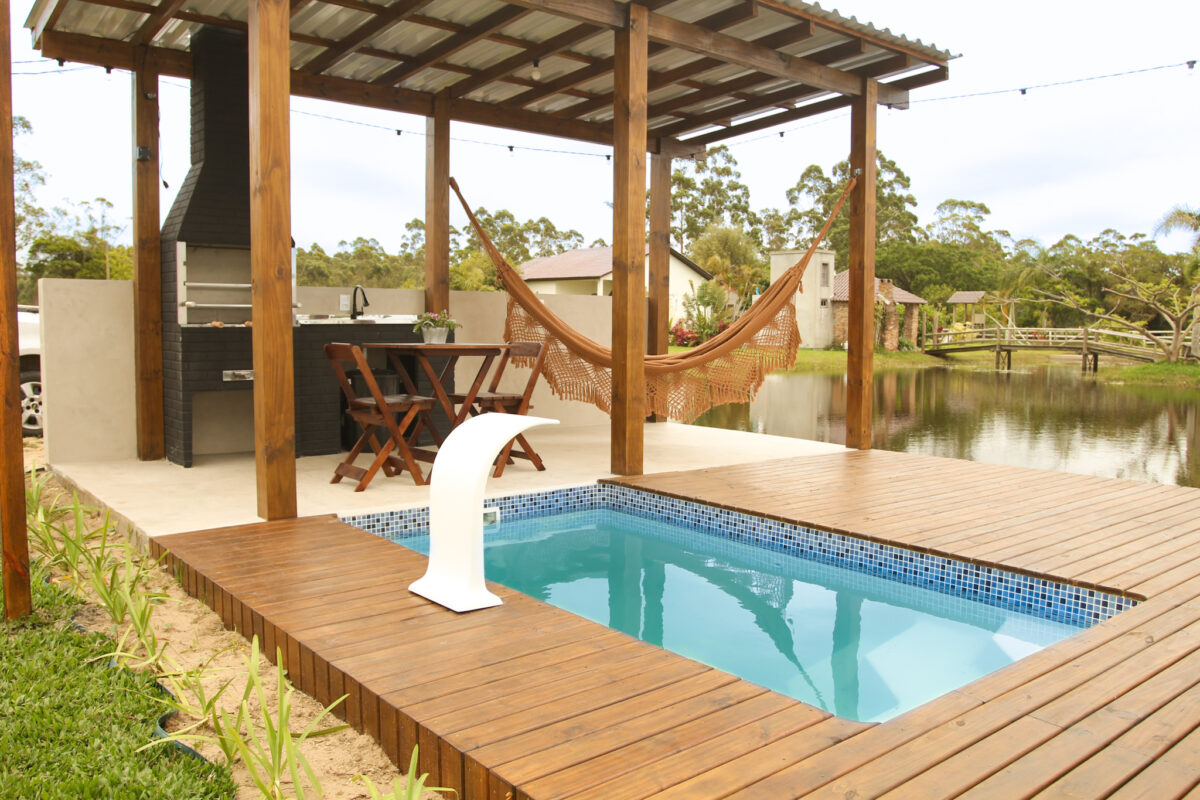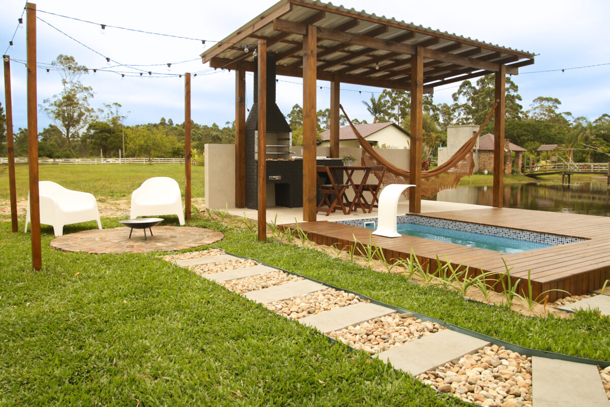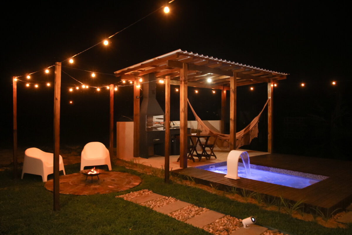 A área externa é um dos grandes destaques, há uma piscina privativa, espaço gourmet com churrasqueira, mesa para refeições externas e uma rede de balanço para momentos de descanso.