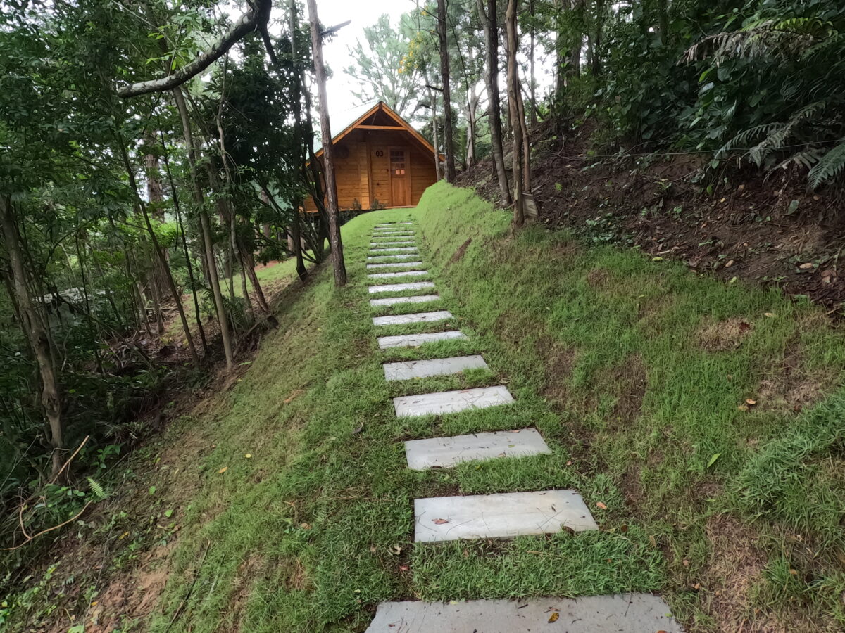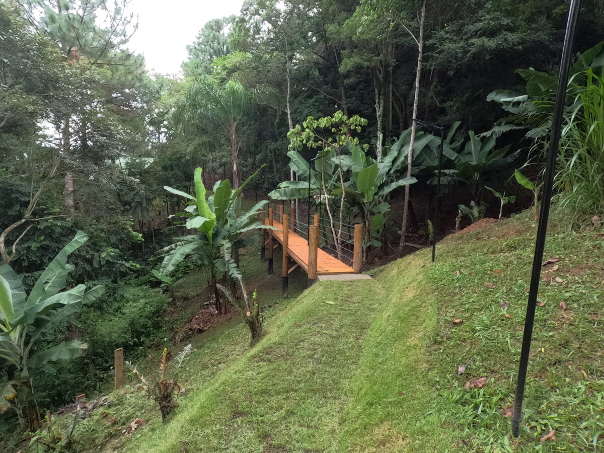 Na área externa, um agradável jardim com gramado para momentos ao ar livre. O chalé está localizado em um terreno onde há outra unidade, porém com distância planejada para preservar a privacidade dos hóspedes. O acesso é feito por uma passarela bem iluminada e sinalizada.