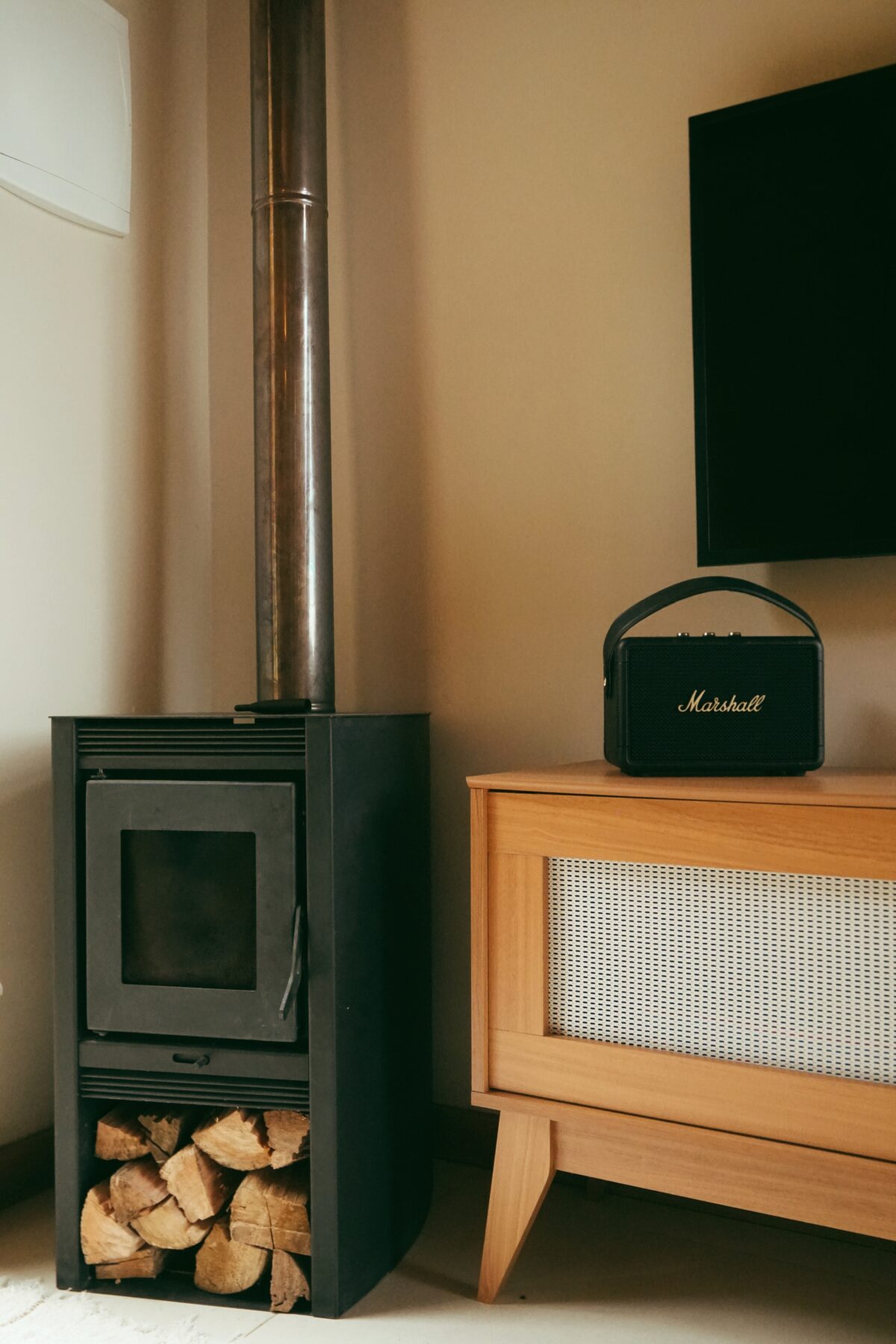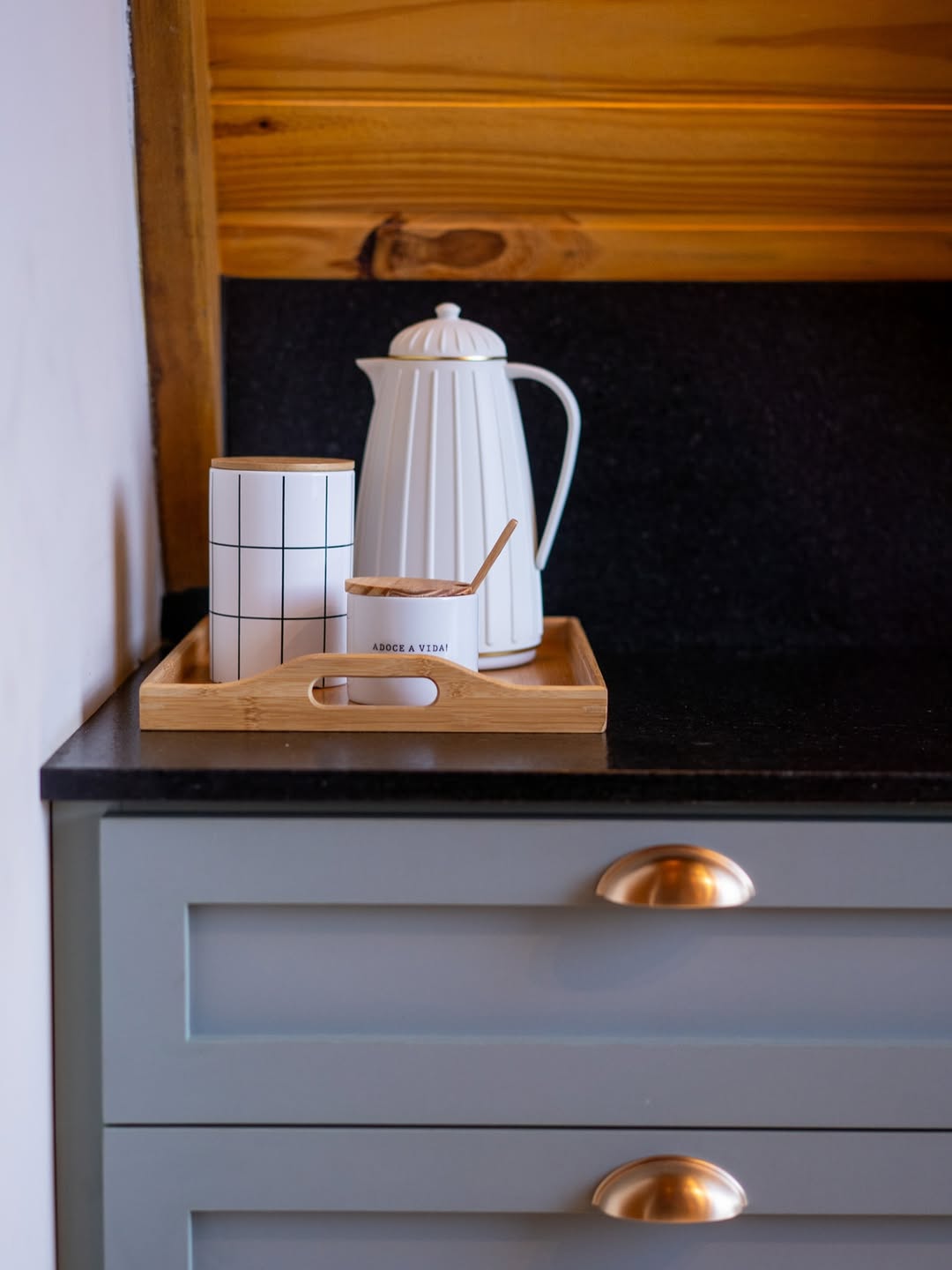 Com uma atmosfera romântica e acolhedora, a área interna conta com um espaço de estar com sofá retrátil, Smart TV, calefator a lenha, vitrola com discos, caixa de som, baralho e alguns jogos para momentos de lazer e descontração. A mesa para refeições integra o ambiente à cozinha, equipada com geladeira, cooktop, forno elétrico e armários com utensílios e eletroportáteis para o preparo de refeições com praticidade.