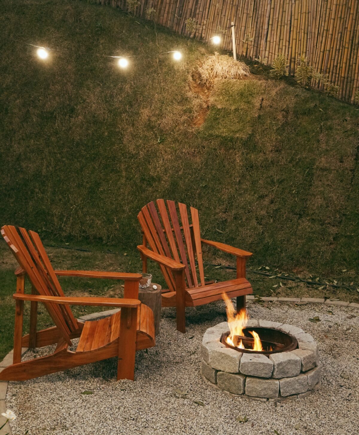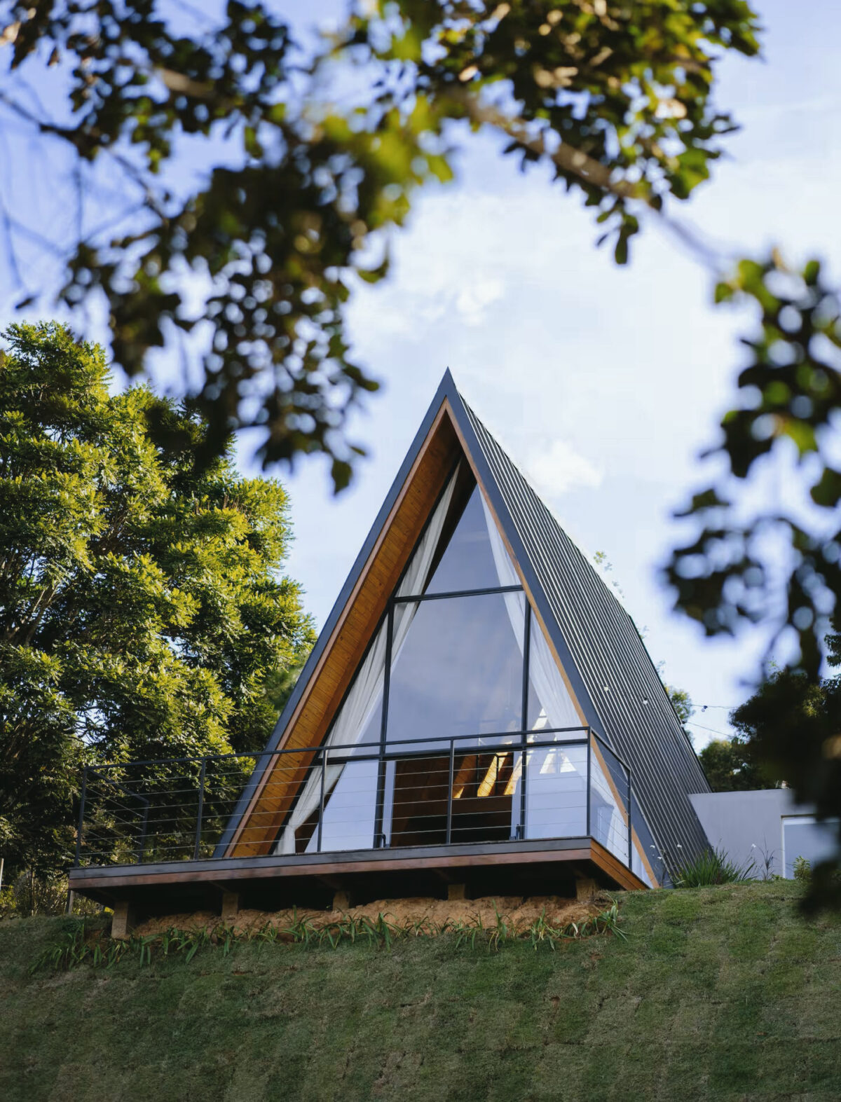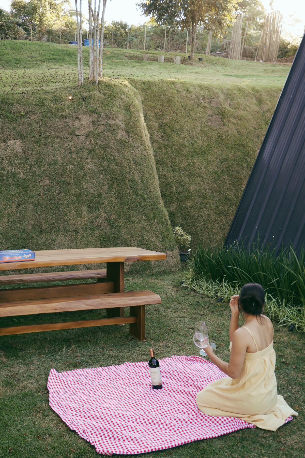 Para completar a experiência, a área externa, com firepit para momentos de fogueira, churrasqueira portátil e mesa para refeições ao ar livre. Além disso, um amplo gramado verde com vista para as montanhas.