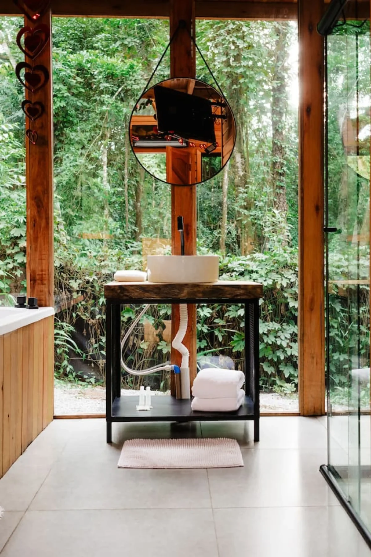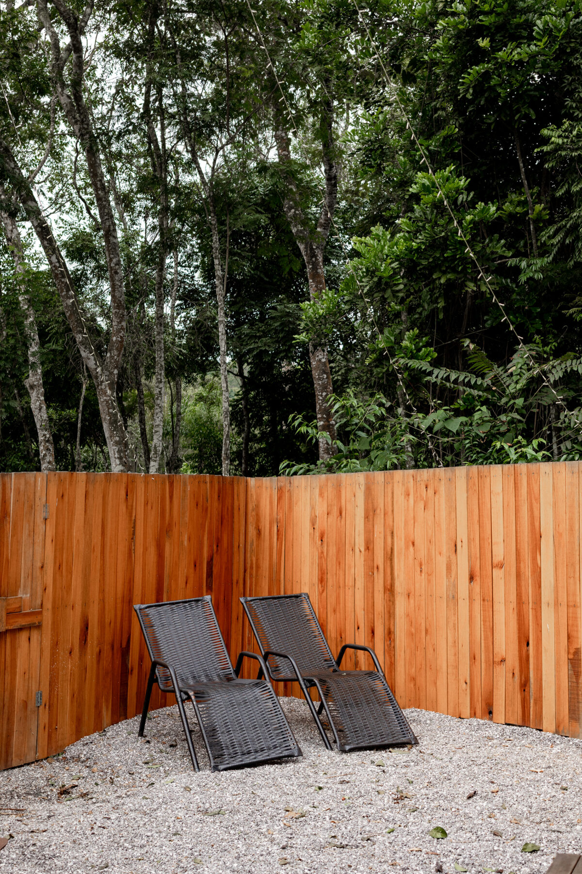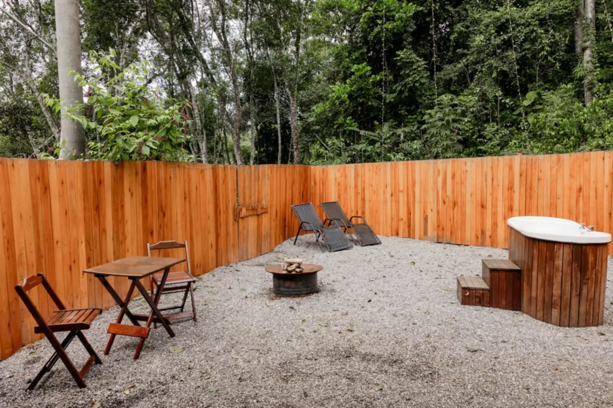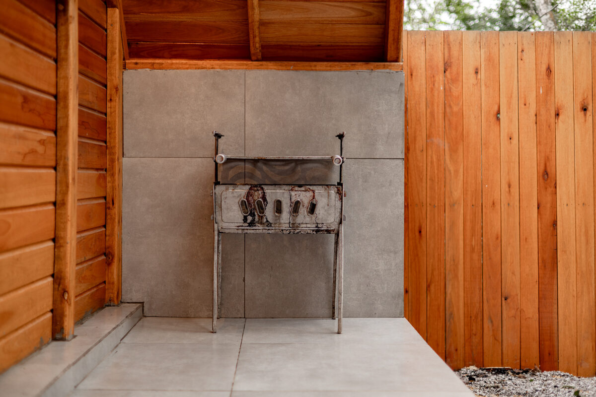 Na área externa, o Chalé Estrela conta com um espaço totalmente privativo, com espreguiçadeiras, mesa e cadeiras para refeições ao ar livre, churrasqueira e um destaque especial: ofurô com hidromassagem, ideal para momentos de descanso cercados pela natureza.