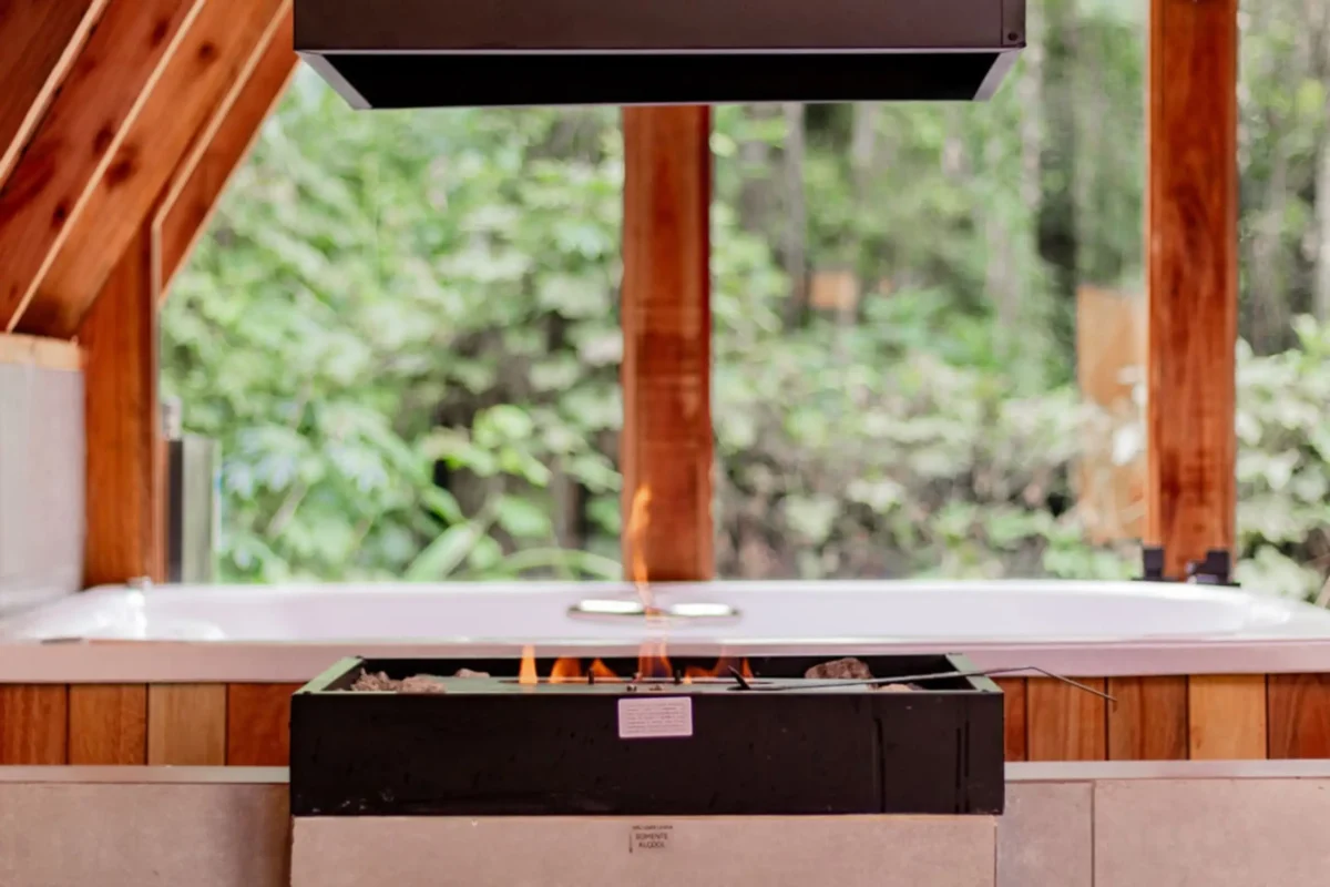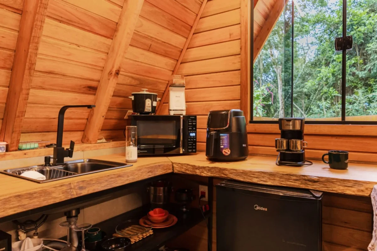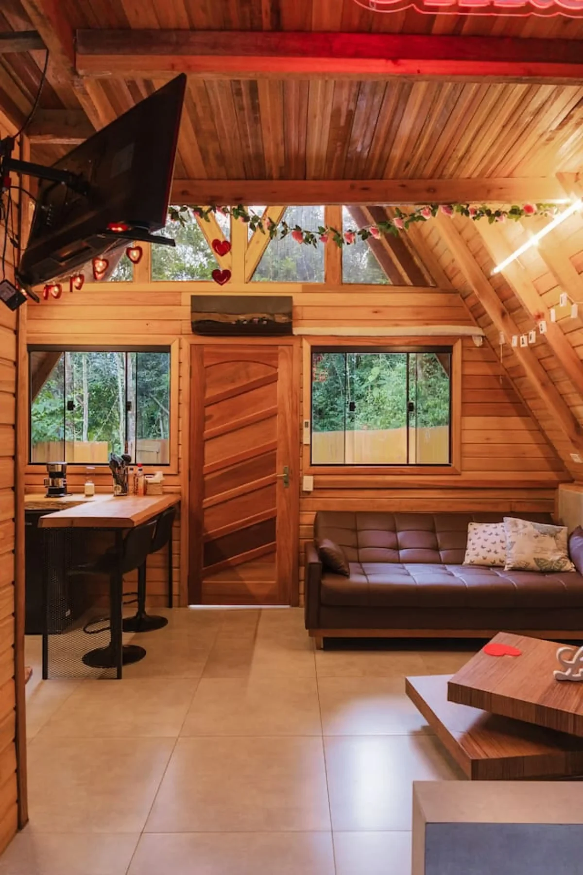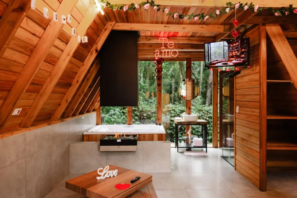 Com arquitetura A-Frame, o chalé possui um ambiente interno acolhedor e bem distribuído. A sala de estar conta com sofá confortável, Smart TV, lareira e ar-condicionado, além de uma jacuzzi interna com hidromassagem, criando uma atmosfera perfeita para relaxar em qualquer estação.