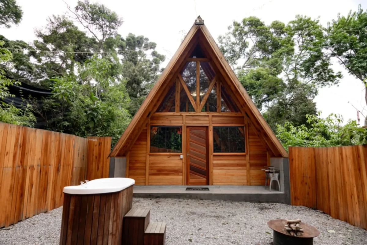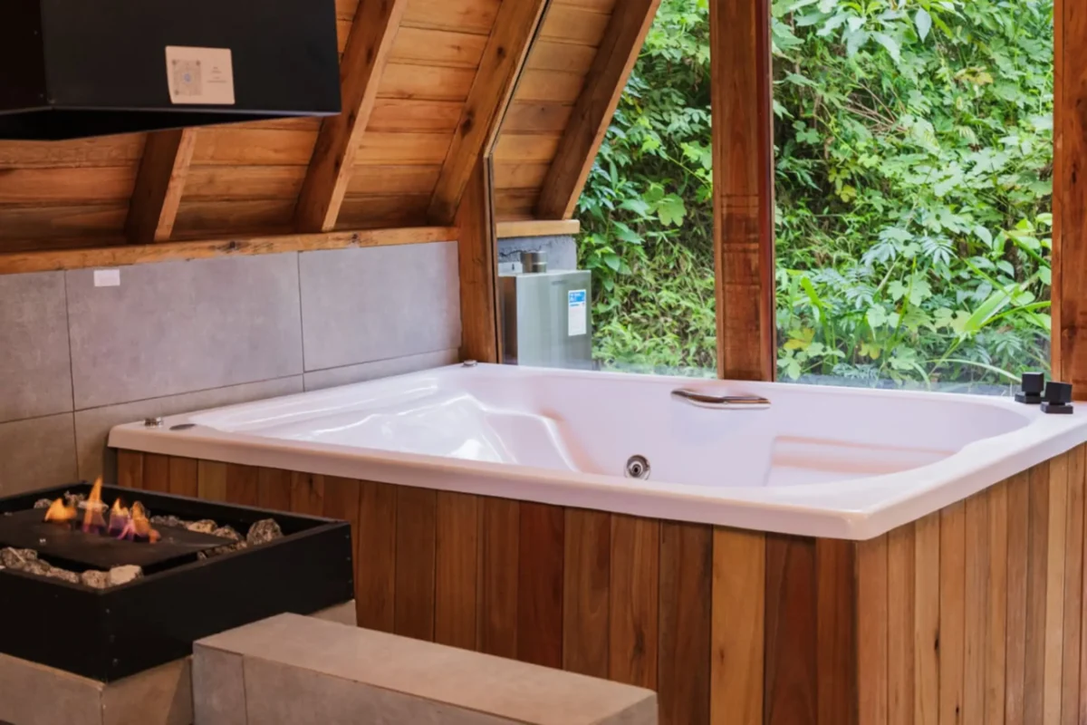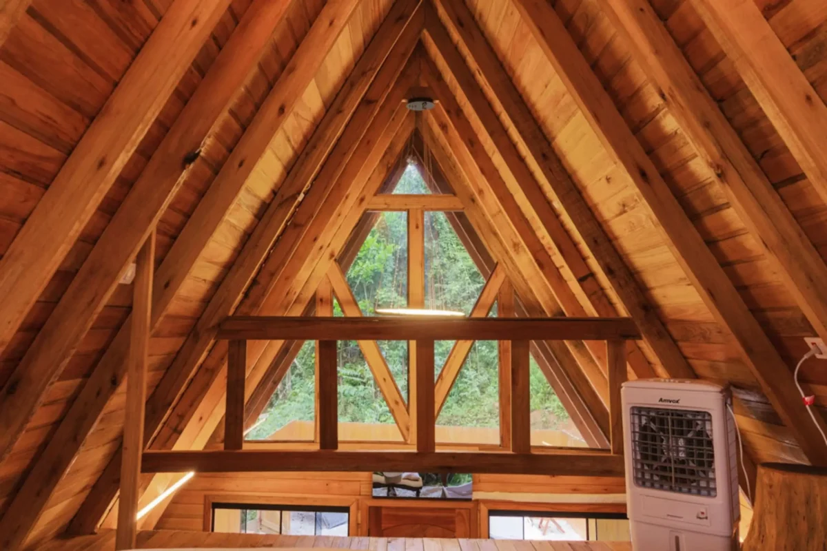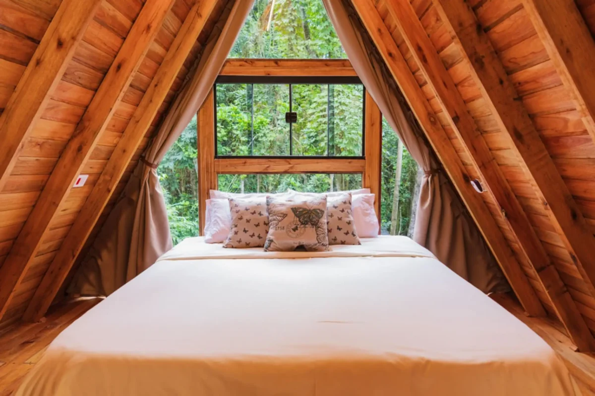 Com arquitetura A-Frame, o chalé possui um ambiente interno acolhedor e bem distribuído. A sala de estar conta com sofá confortável, Smart TV, lareira e ar-condicionado, além de uma jacuzzi interna com hidromassagem, criando uma atmosfera perfeita para relaxar em qualquer estação.