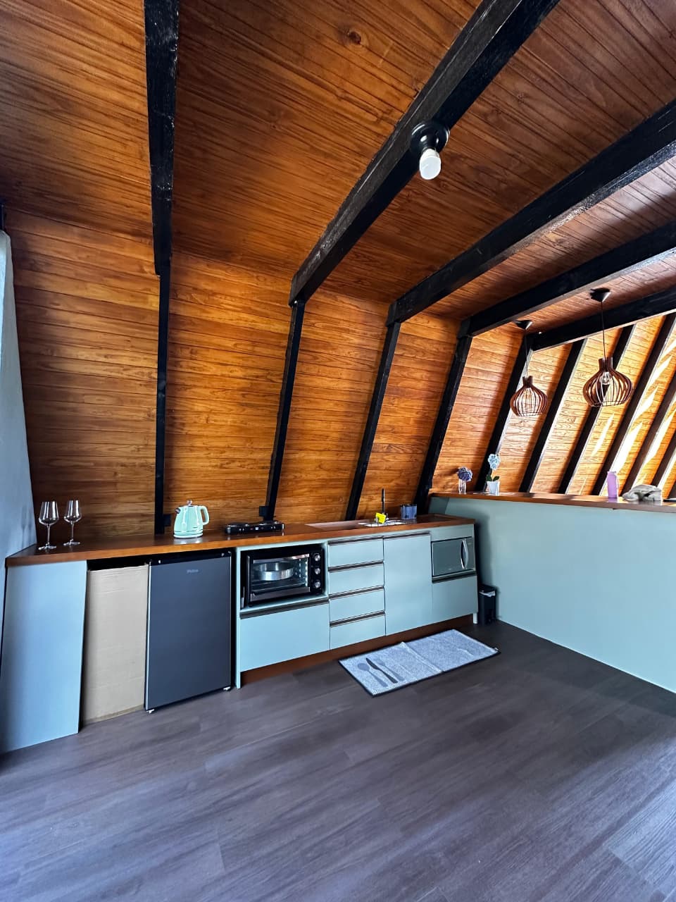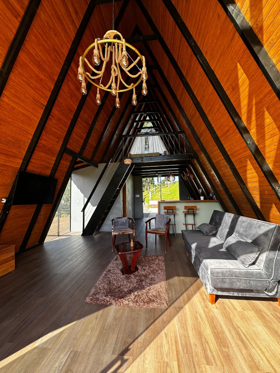 Com 108m² de área construída, o interior do chalé combina o charme rústico da serra com muita iluminação natural. A sala de estar conta com sofá-cama confortável, lareira e Smart TV. Além disso, Integrando o espaço, um balcão com banquetas conecta a cozinha equipada com frigobar, cooktop, forno elétrico, micro-ondas e utensílios completos para o preparo de refeições.