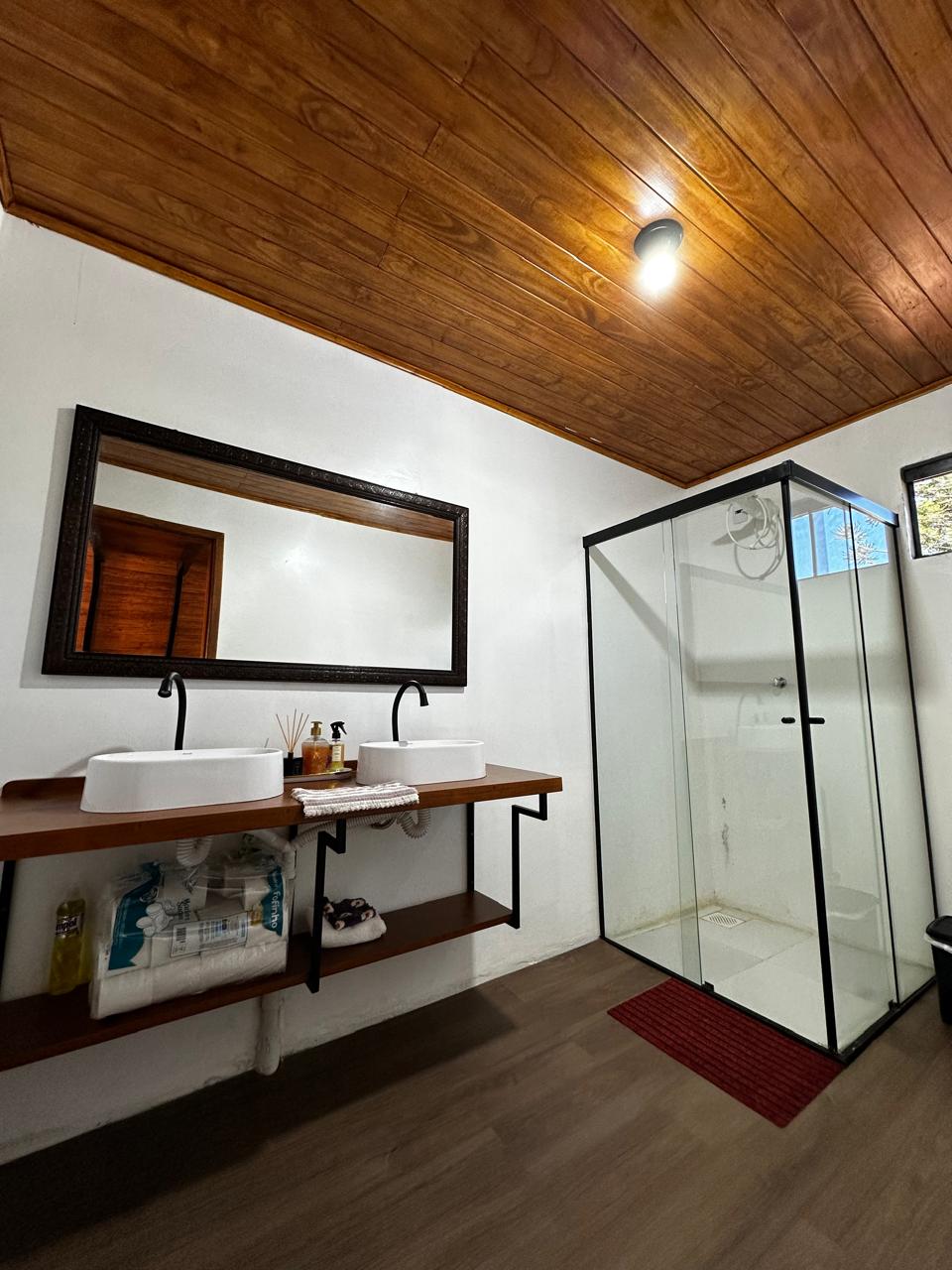 O banheiro dispõe de ducha quente, pia dupla, toalhas e amenidades. No mezanino, o quarto principal com cama de casal e enxoval completo.