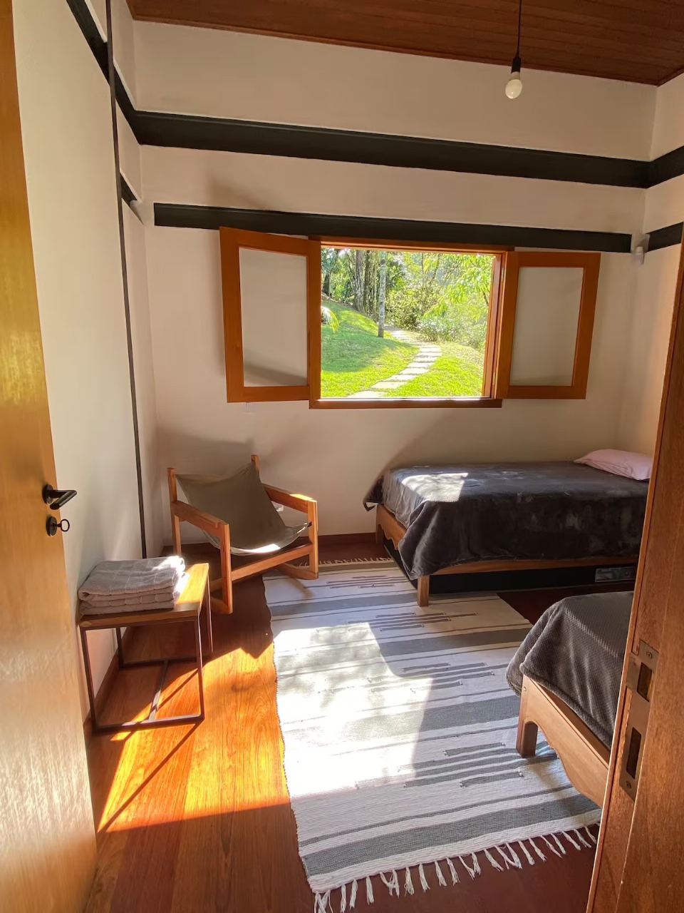Seguindo pelo corredor, você encontrará dois quartos acolhedores, sendo um com cama de casal e outro com duas camas de solteiro, ambos com enxoval completo e janelas e varandas que oferecem vistas encantadoras da natureza. O banheiro é um verdadeiro destaque, com pia dupla, ducha com água quente e toalhas, além de uma banheira de imersão para momentos de relaxamento completo.