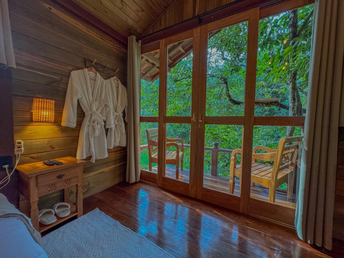 A área interna do Chalé Natureza e Luxo oferece uma experiência de aconchego e sofisticação. O espaço é totalmente integrado. Uma cama queen size com enxoval de alta qualidade, ar condicionado, closet com cabides e cortinas blackout.