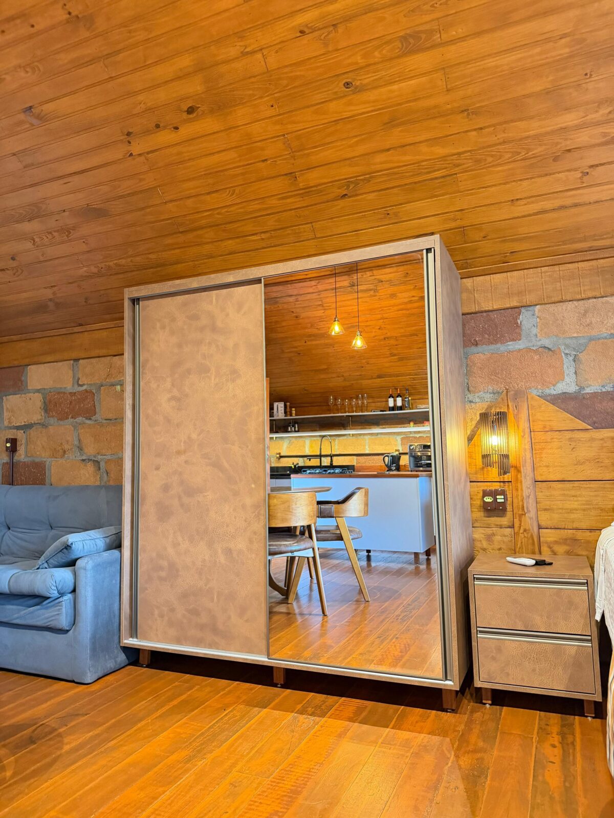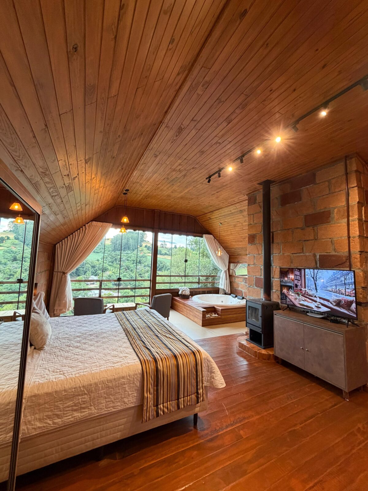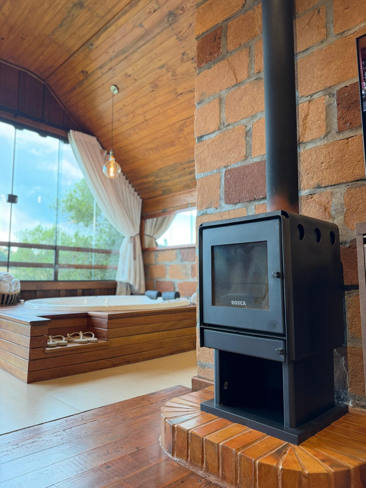 Além disso, um sofá-cama e uma lareira aconchegante. O destaque fica por conta da jacuzzi com hidromassagem posicionada ao lado da janela, ideal para banhos relaxantes com vista para a natureza. Há também uma cozinha compacta, mas bem equipada, com cooktop, geladeira, air fryer e utensílios para o preparo de refeições. O banheiro dispõe de ducha de água quente, toalhas e amenidades.