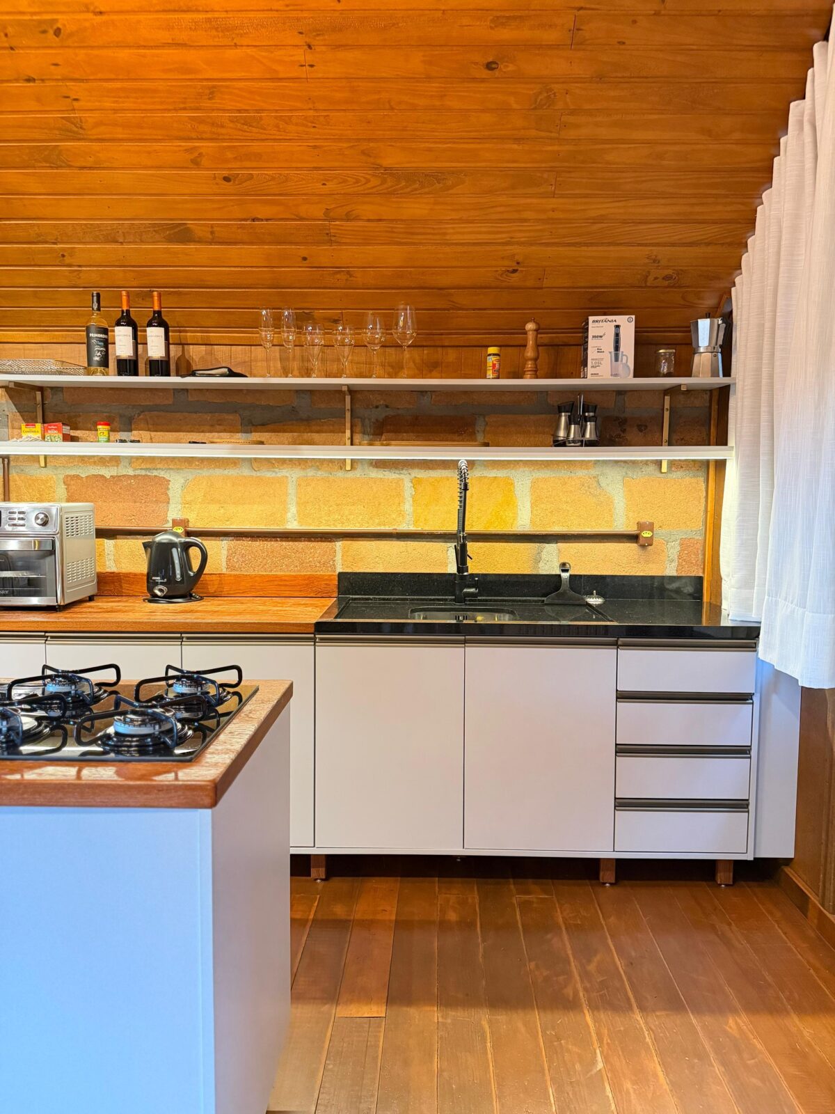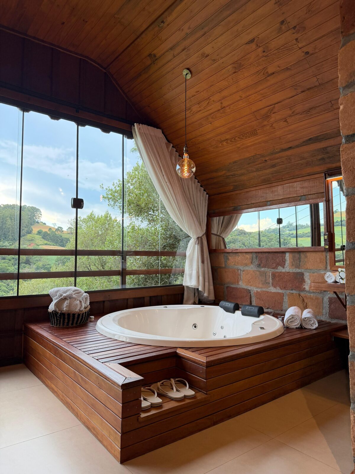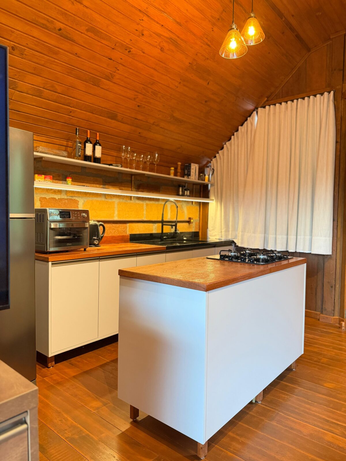 Além disso, um sofá-cama e uma lareira aconchegante. O destaque fica por conta da jacuzzi com hidromassagem posicionada ao lado da janela, ideal para banhos relaxantes com vista para a natureza. Há também uma cozinha compacta, mas bem equipada, com cooktop, geladeira, air fryer e utensílios para o preparo de refeições. O banheiro dispõe de ducha de água quente, toalhas e amenidades.
