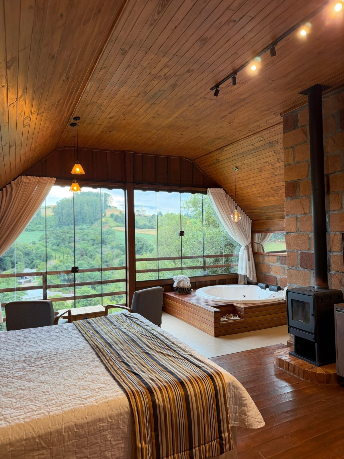O Chalé Vicenza no Palazzo Veneto é um refúgio pensado para quem busca momentos a dois em meio ao verde da Serra Gaúcha. No charmoso distrito de Vila Evangelista, combinando clima romântico, tranquilidade e conexão com a natureza, perfeito para quem quer fugir da rotina agitada.