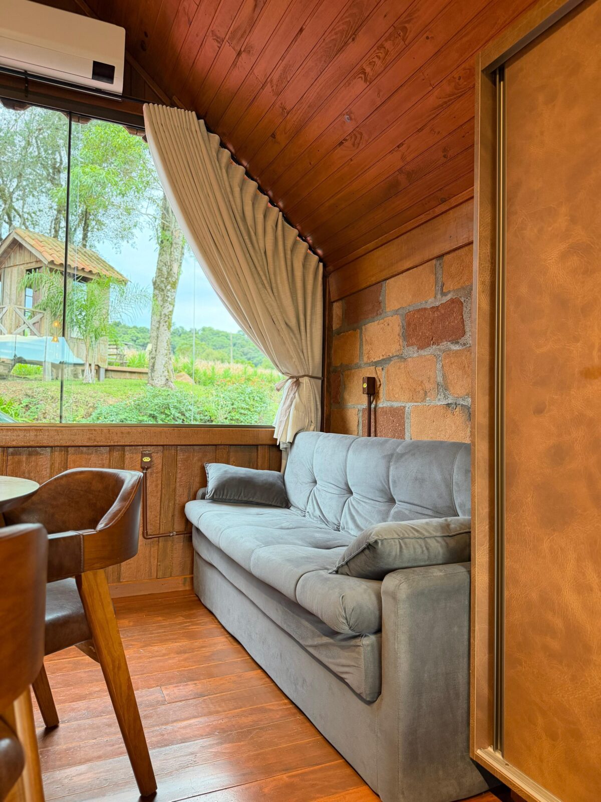 Na área externa, o Chalé Vicenza está cercado pela natureza da Serra Gaúcha, oferecendo um cenário tranquilo e cheio de verde ao redor. Mesmo localizado em um terreno com outros chalés, cada unidade foi pensada para garantir privacidade, com bom distanciamento e acesso independente. No local, há também um restaurante que oferece opções de refeições.