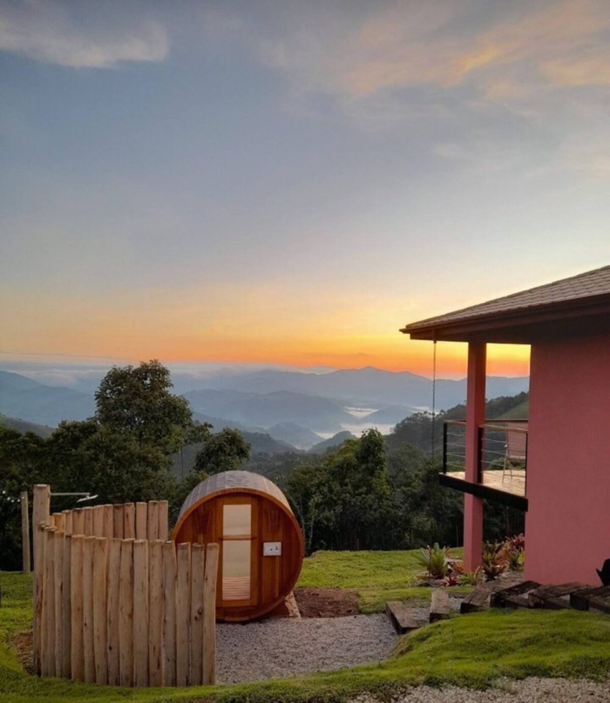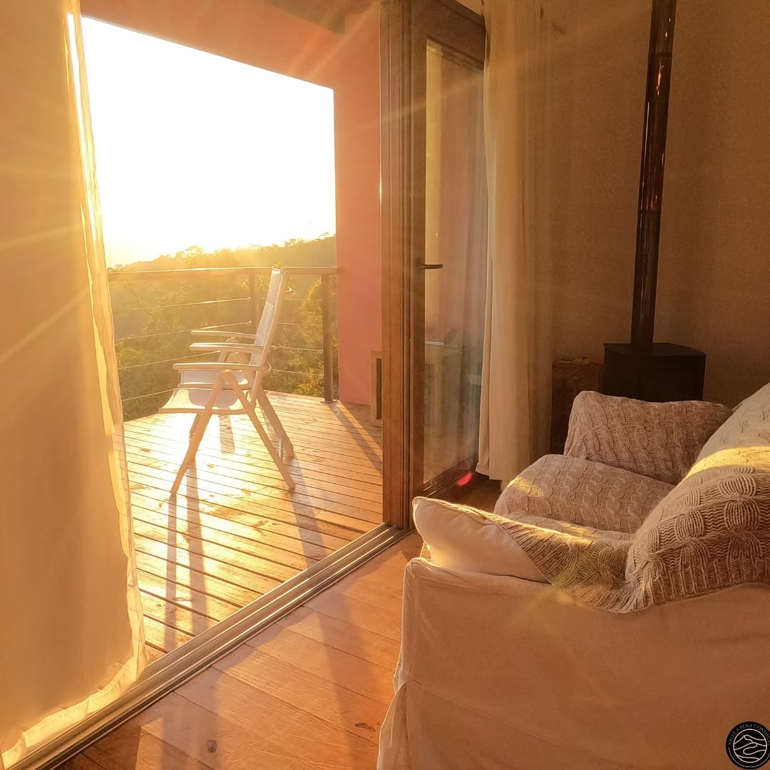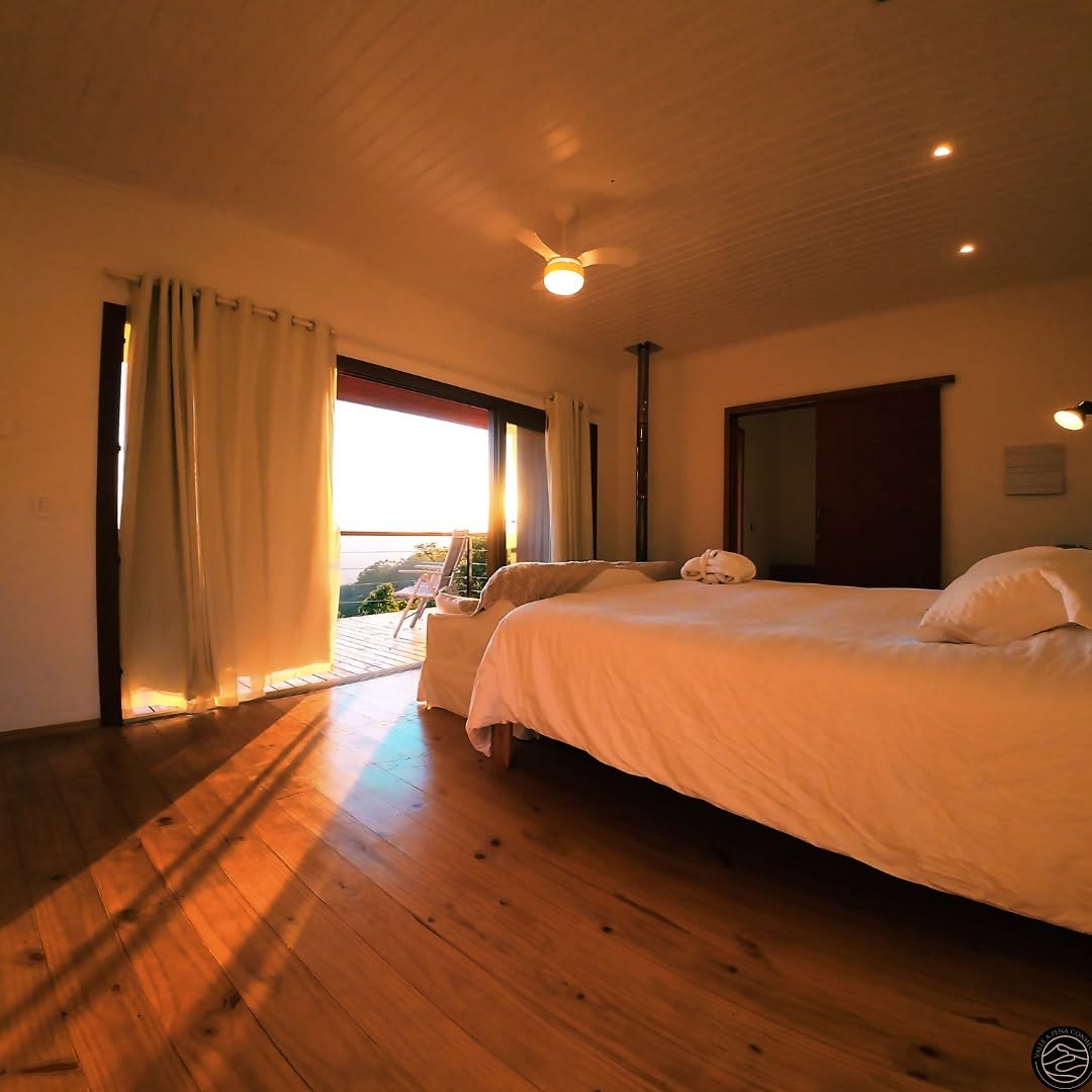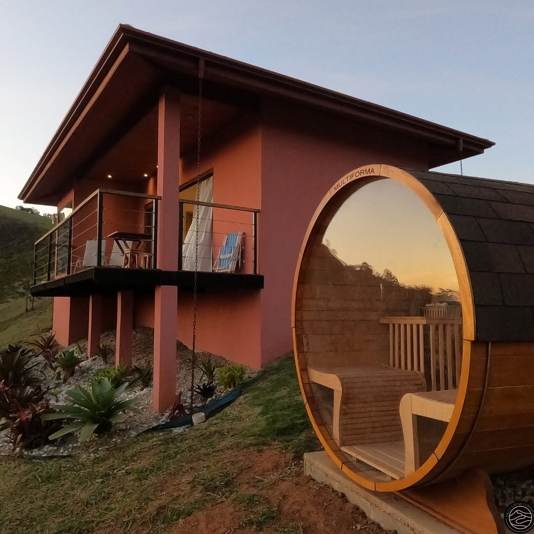 Na área externa você encontra um deck de madeira com parapeito, com espaço para descanso ou home office, com churrasqueira, além de uma sauna privativa. A vista do nascer do sol é protagonista e pode ser apreciada até mesmo sem sair da cama.