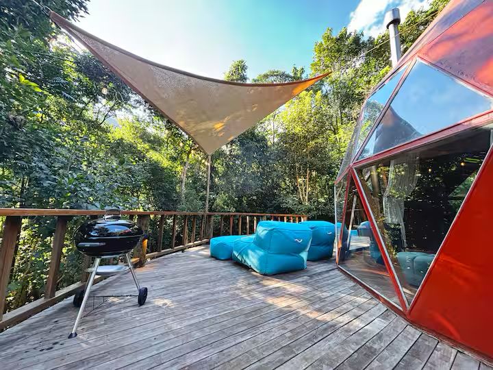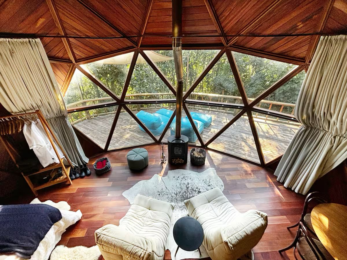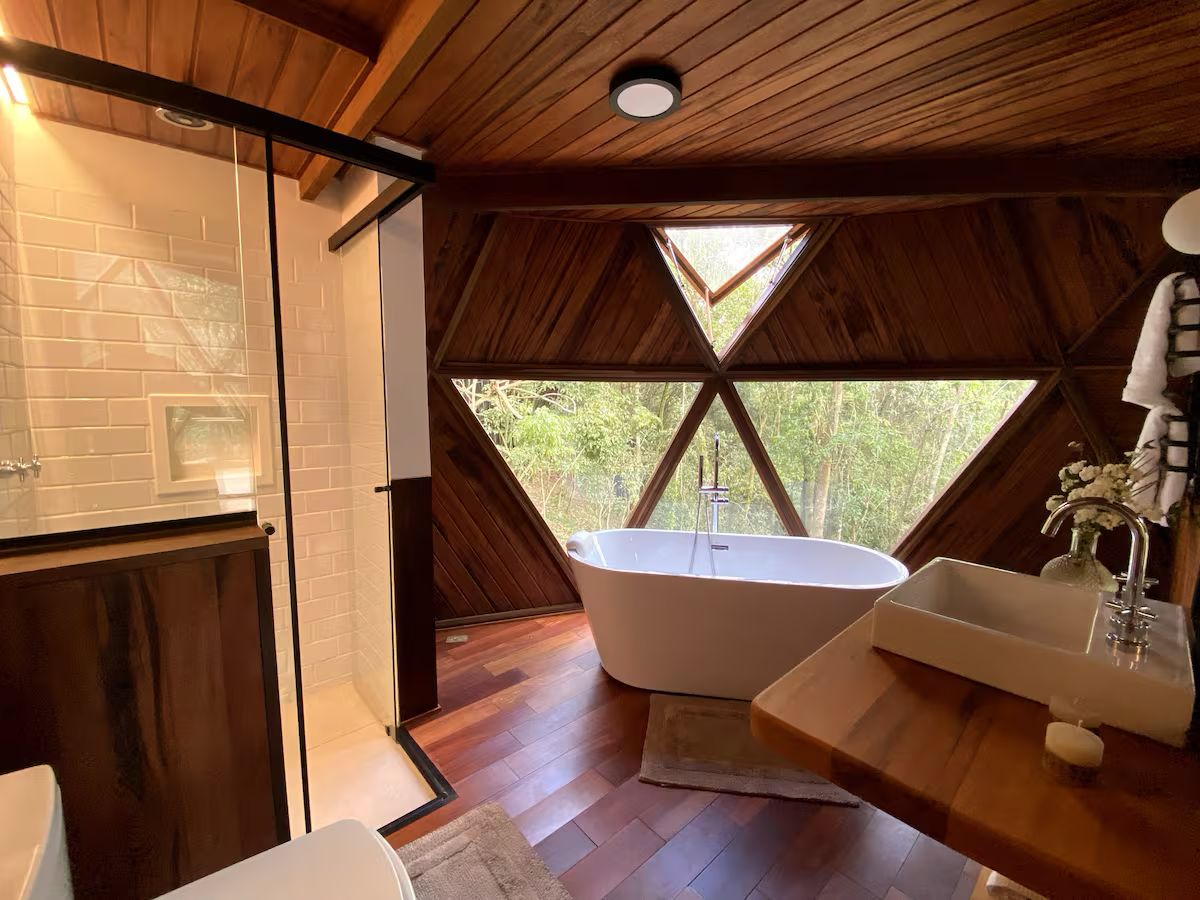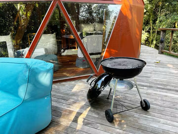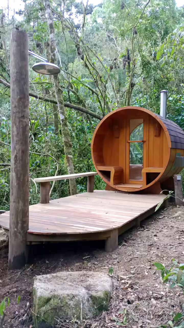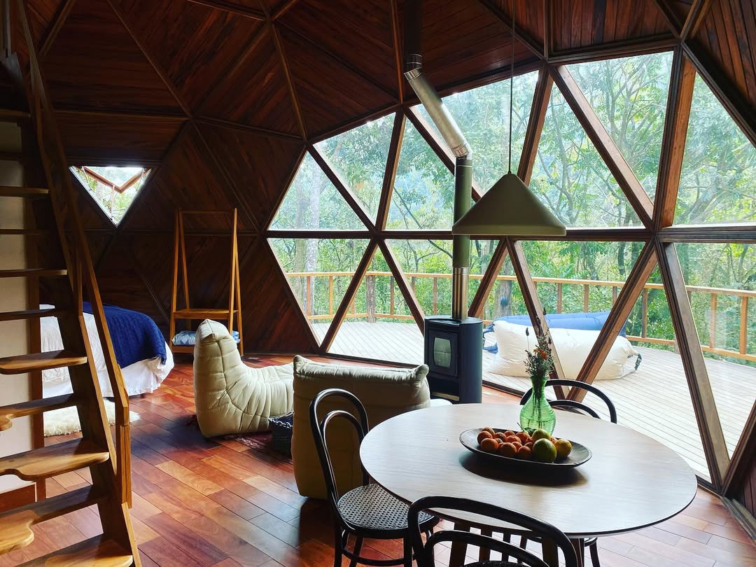 Na área externa, há um deck todo de madeira com contato direto com a natureza. O Domo Matú também conta com acesso à trilhas, cachoeira privada, churrasqueira e sauna barril, perfeita para descansar com vista para a flora da Serra da Mantiqueira.