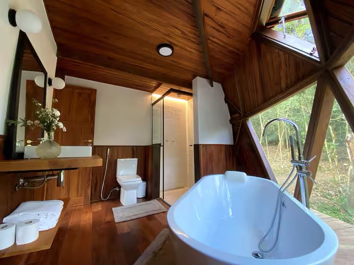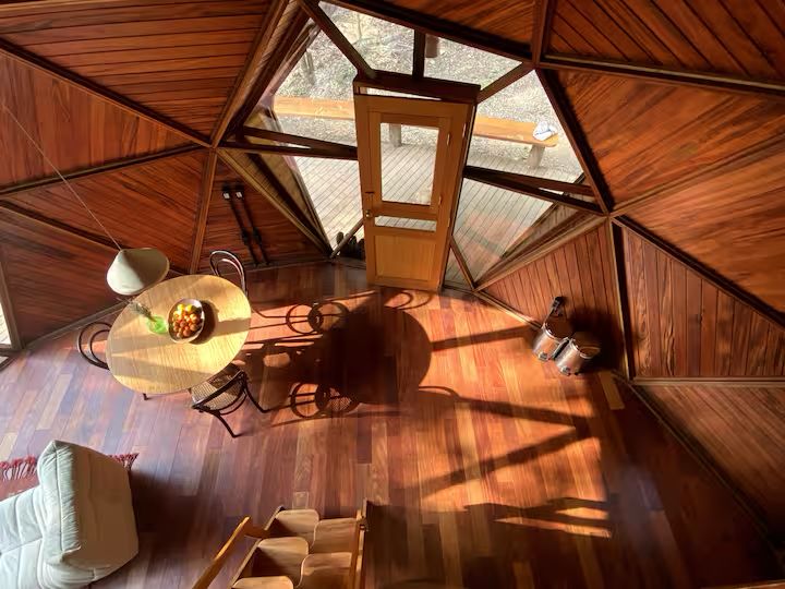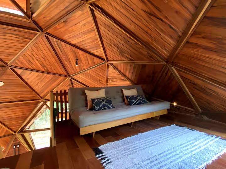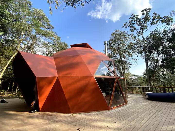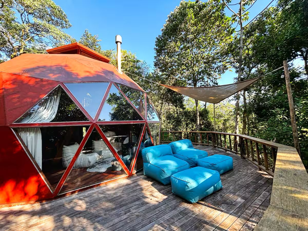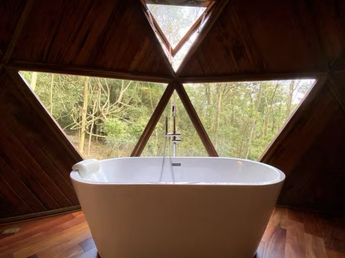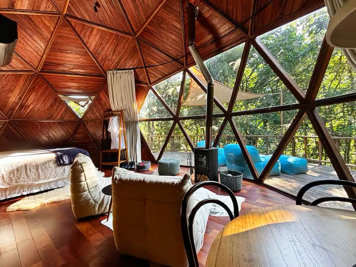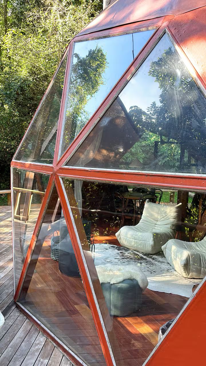 Na área externa, há um deck todo de madeira com contato direto com a natureza. O Domo Matú também conta com acesso à trilhas, cachoeira privada, churrasqueira e sauna barril, perfeita para descansar com vista para a flora da Serra da Mantiqueira.