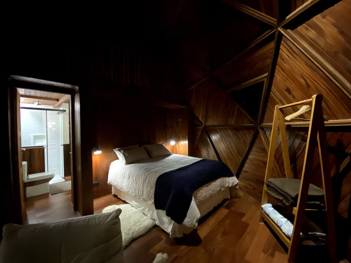 Além disso, o quarto conta com uma cama queen size e espaço para itens pessoais. Subindo as escadas para o mezanino, há um sofá-cama e TV. O banheiro conta com ducha aquecida, amenities e o destaque que é a banheira de imersão para momentos relaxantes com vista para a natureza.