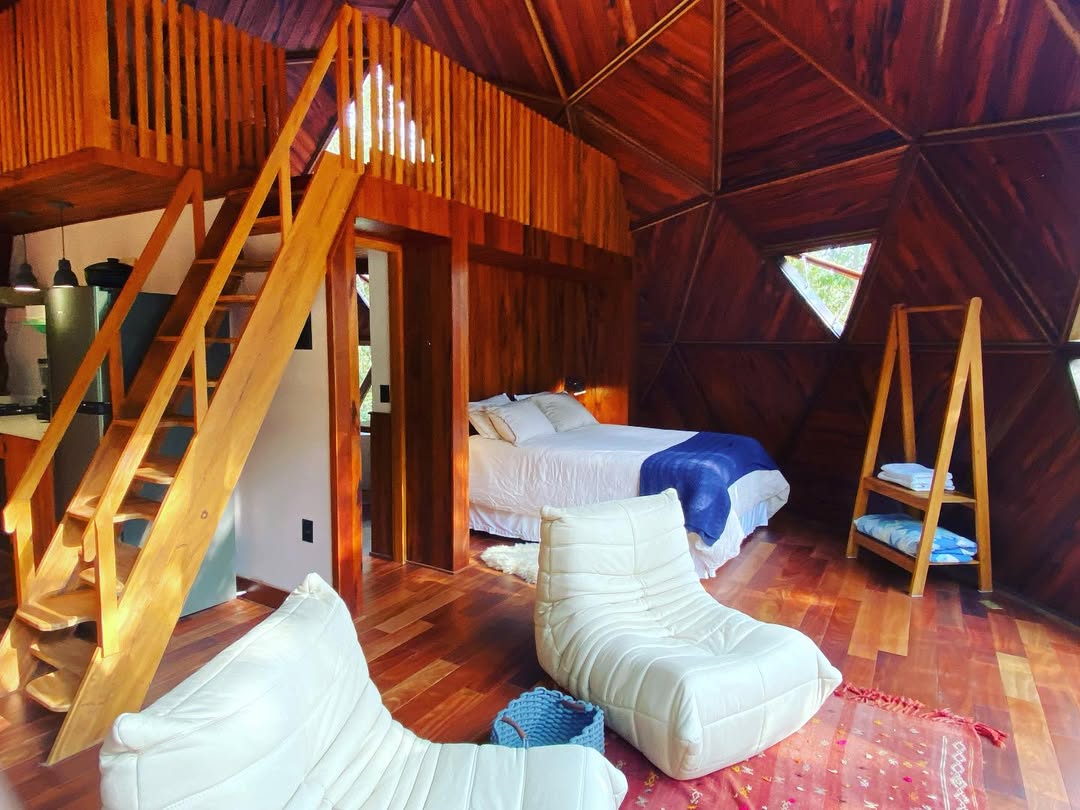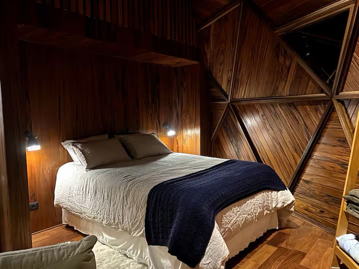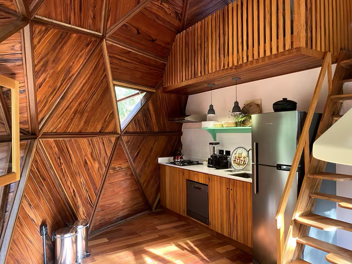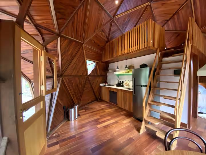 O ambiente do domo é totalmente integrado. A cozinha é completa, possui geladeira, fogão, forno, máquina de lavar louça e utensílios para o preparo das refeições. A sala de estar conta com duas poltronas confortáveis, cortinas blackout, lareira e espaço para jantar.
