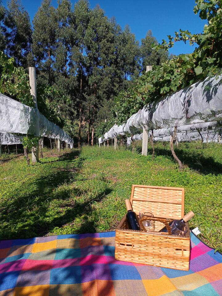 Os hóspedes têm acesso aos 16 hectares da propriedade com rio de águas limpas, trilhas, fauna e flora nativas. Conta com sala com lareira e sofá-cama de casal, cozinha integrada, banheiro e ampla sacada, onde poderá ficar na rede ou fazer refeições olhando para o vinhedo.