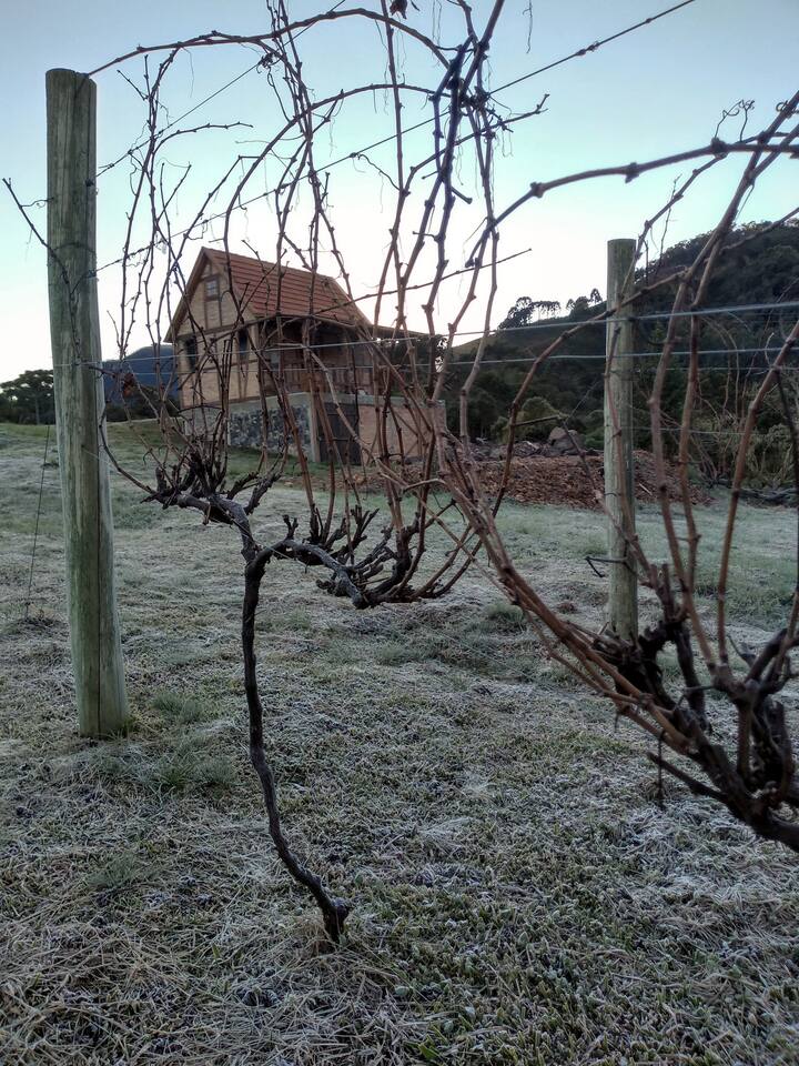 Charmosa casa em estilo enxaimel com vista para vinhedo, totalmente construída em cima do porão de pedra onde fazemos o ‘vinho de autor’ da Bodega do Paraíso.
