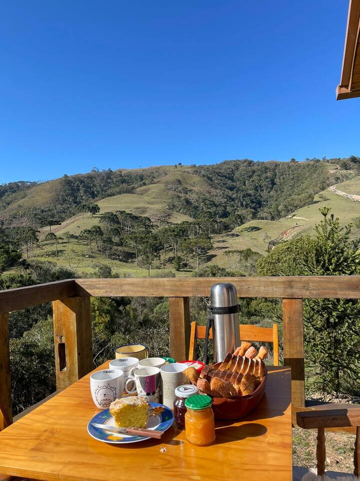 Na parte superior, temos cama de casal e vista para vale e céu estrelado.
