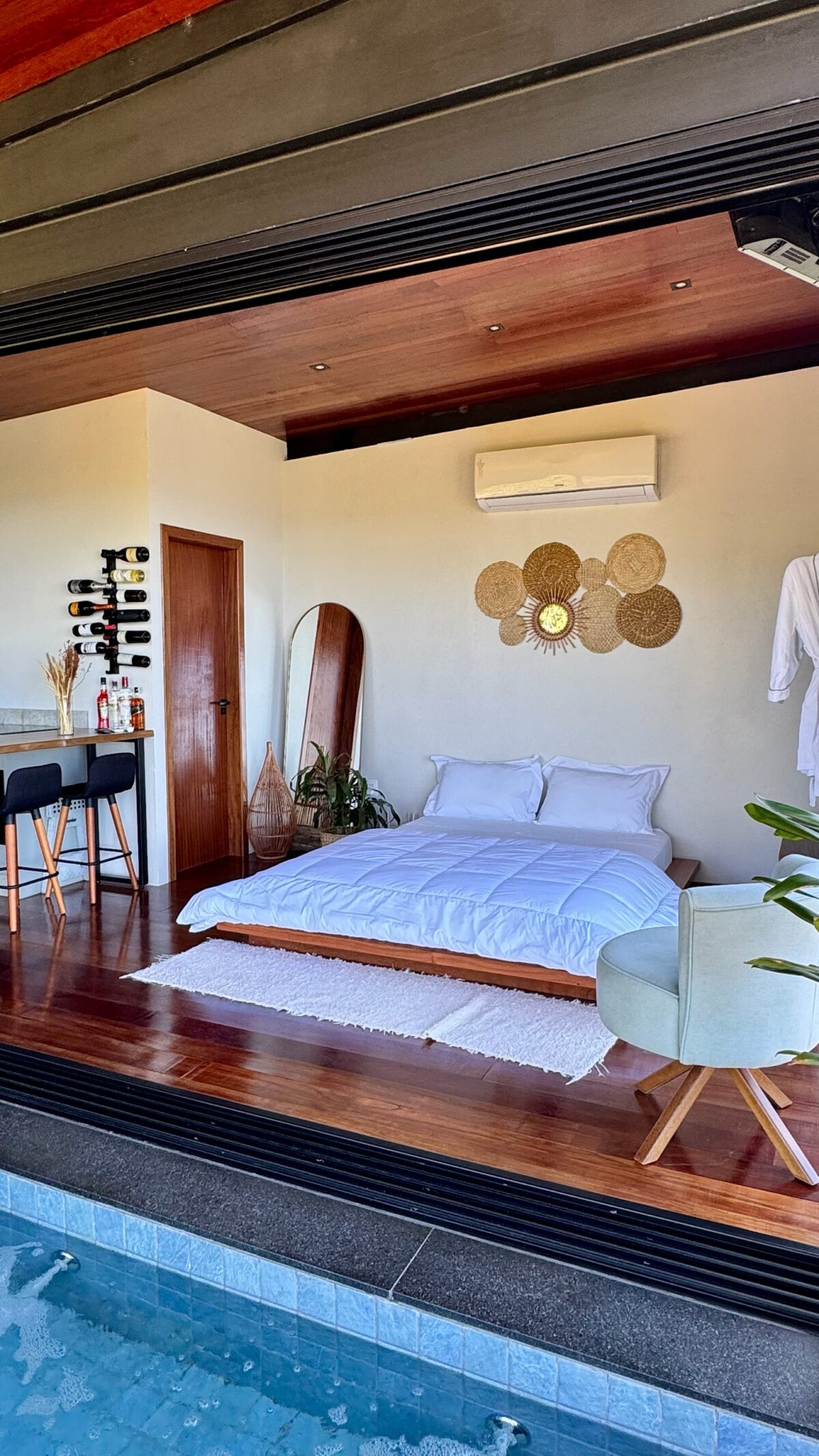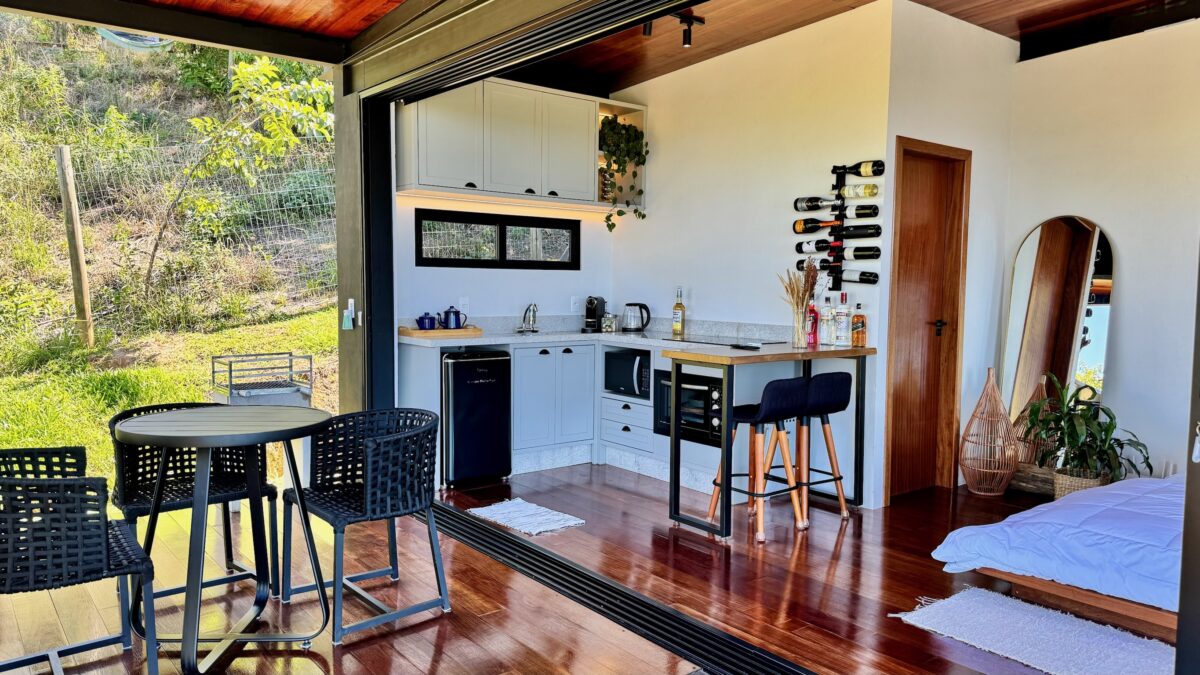 Com um conceito 100% aberto, o loft valoriza a integração entre os ambientes, as amplas janelas e a porta de correr permitem que a luz natural invada o espaço, garantindo uma vista para a natureza em praticamente todos os cantos. O ambiente principal conta com cama queen, enxoval completo, cortinas blackout, ar-condicionado, poltrona e Smart TV.