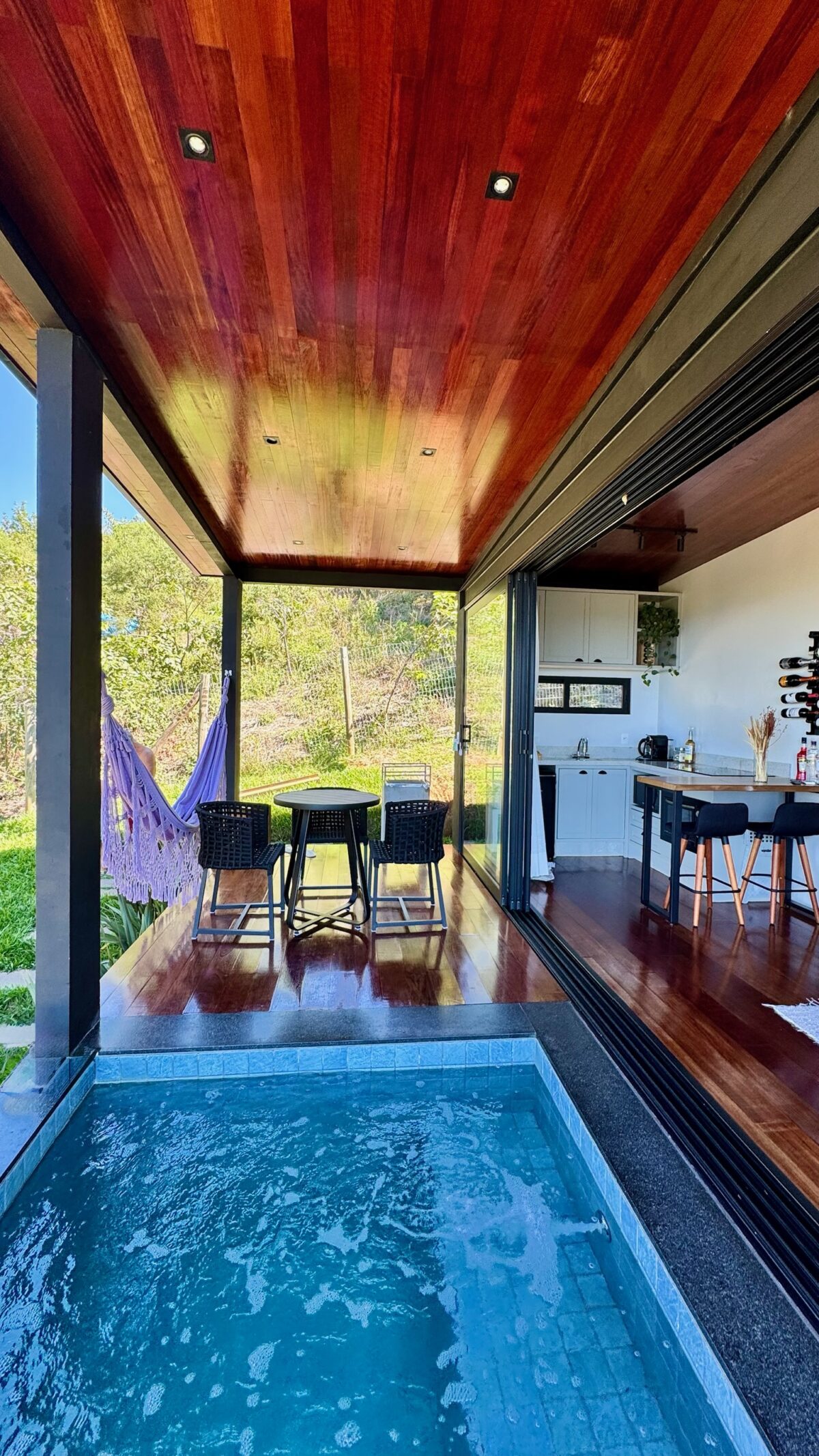 Na área externa, um deck de madeira com mesa e cadeiras para refeições ao ar livre, churrasqueira, rede de balanço e um redário suspenso. Além disso, o grande destaque fica por conta da piscina aquecida, perfeita para relaxar com vista para a natureza.