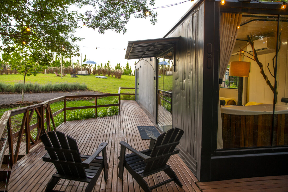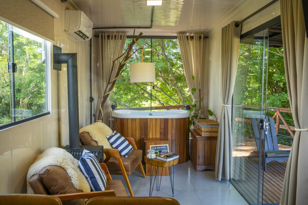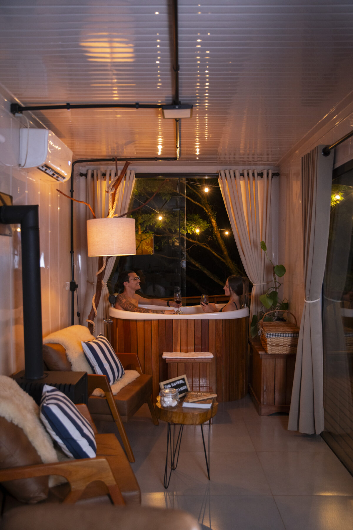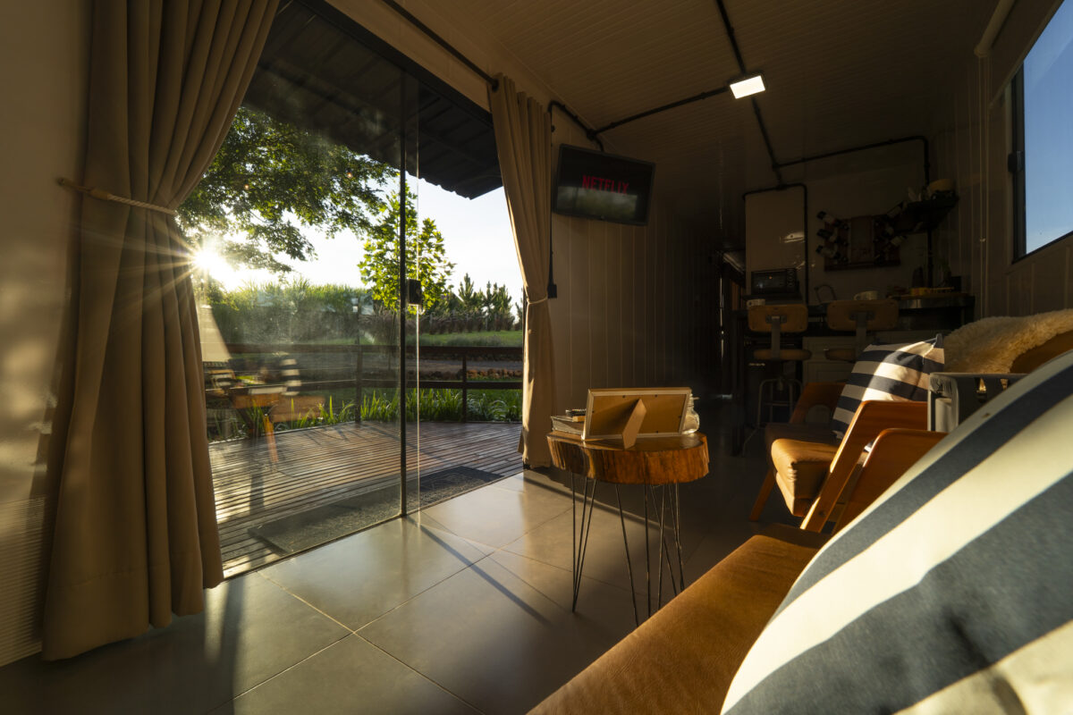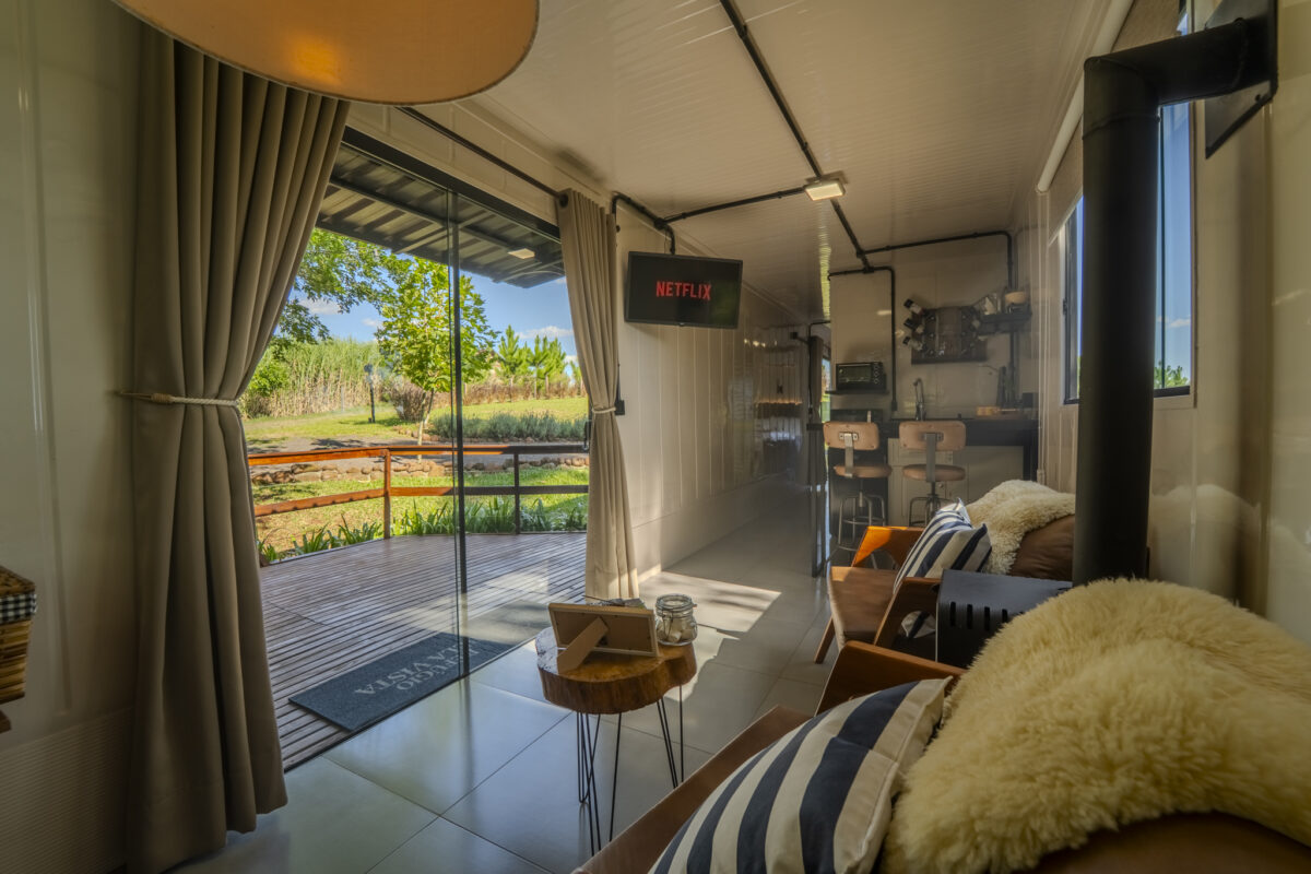 blackout e Projetor. Para maior comodidade, um banheiro completo dispondo de ducha com aquecimento à gás, toalhas e roupões, secador de cabelo e amenidades. Um charme especial da Morada Container é um cantinho dispondo de um ofurô com hidromassagem oferecendo uma vista incrível para a natureza ao redor. Além disso, uma lareira aconchegante, com poltronas confortáveis ao lado e TV Smart 32′. Na área externa, um deck de madeira com cadeiras convida você a relaxar e apreciar a vista deslumbrante do noroeste gaúcho. Além disso, um amplo gramado proporciona o ambiente ideal para um piquenique ao ar livre. Também possuímos fogo de chão com trempe campeira e a vista do pôr do sol.