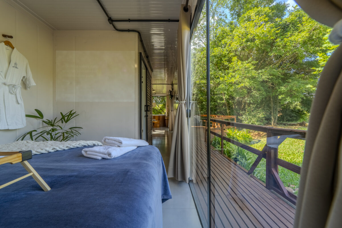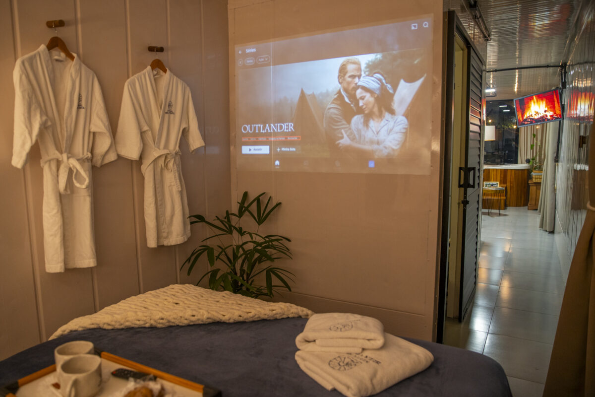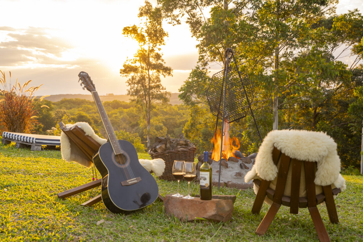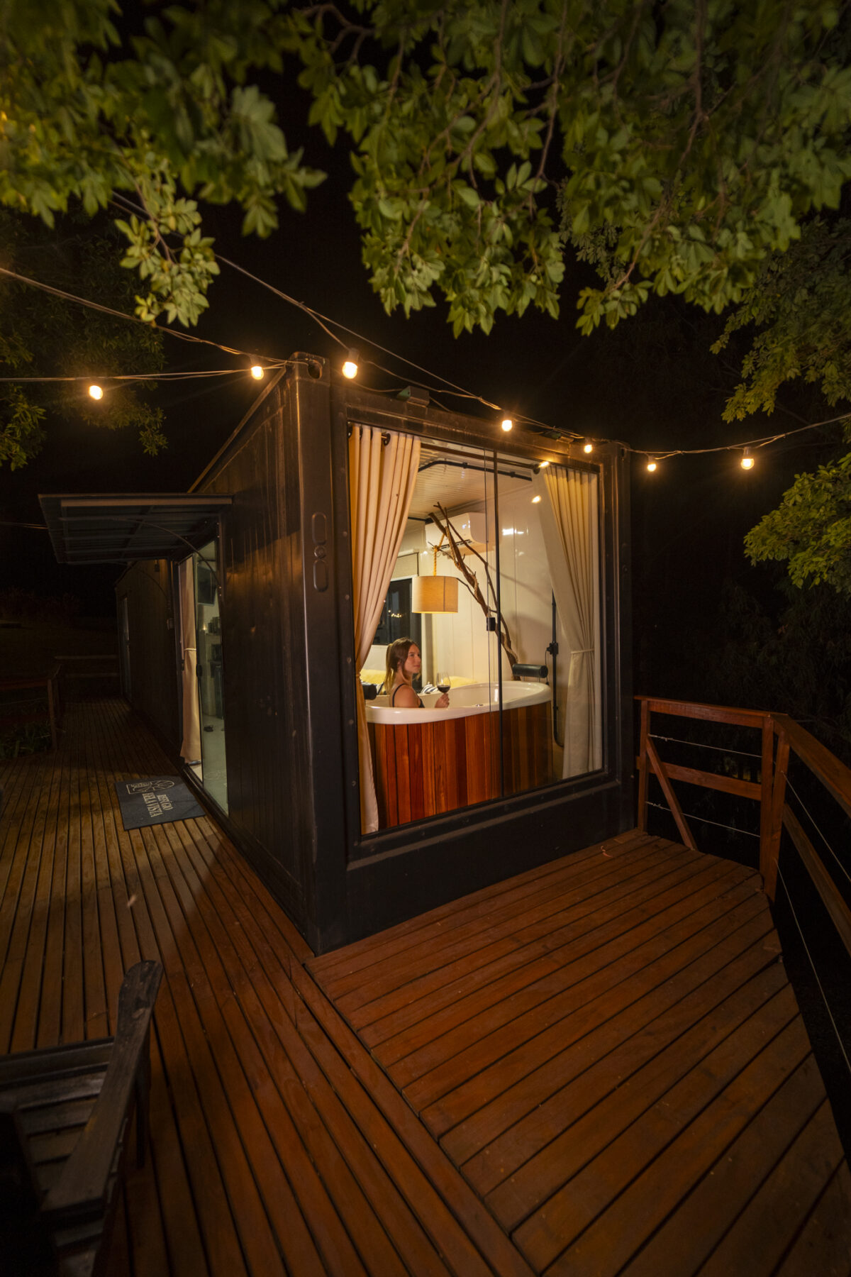 blackout e Projetor. Para maior comodidade, um banheiro completo dispondo de ducha com aquecimento à gás, toalhas e roupões, secador de cabelo e amenidades. Um charme especial da Morada Container é um cantinho dispondo de um ofurô com hidromassagem oferecendo uma vista incrível para a natureza ao redor. Além disso, uma lareira aconchegante, com poltronas confortáveis ao lado e TV Smart 32′. Na área externa, um deck de madeira com cadeiras convida você a relaxar e apreciar a vista deslumbrante do noroeste gaúcho. Além disso, um amplo gramado proporciona o ambiente ideal para um piquenique ao ar livre. Também possuímos fogo de chão com trempe campeira e a vista do pôr do sol.