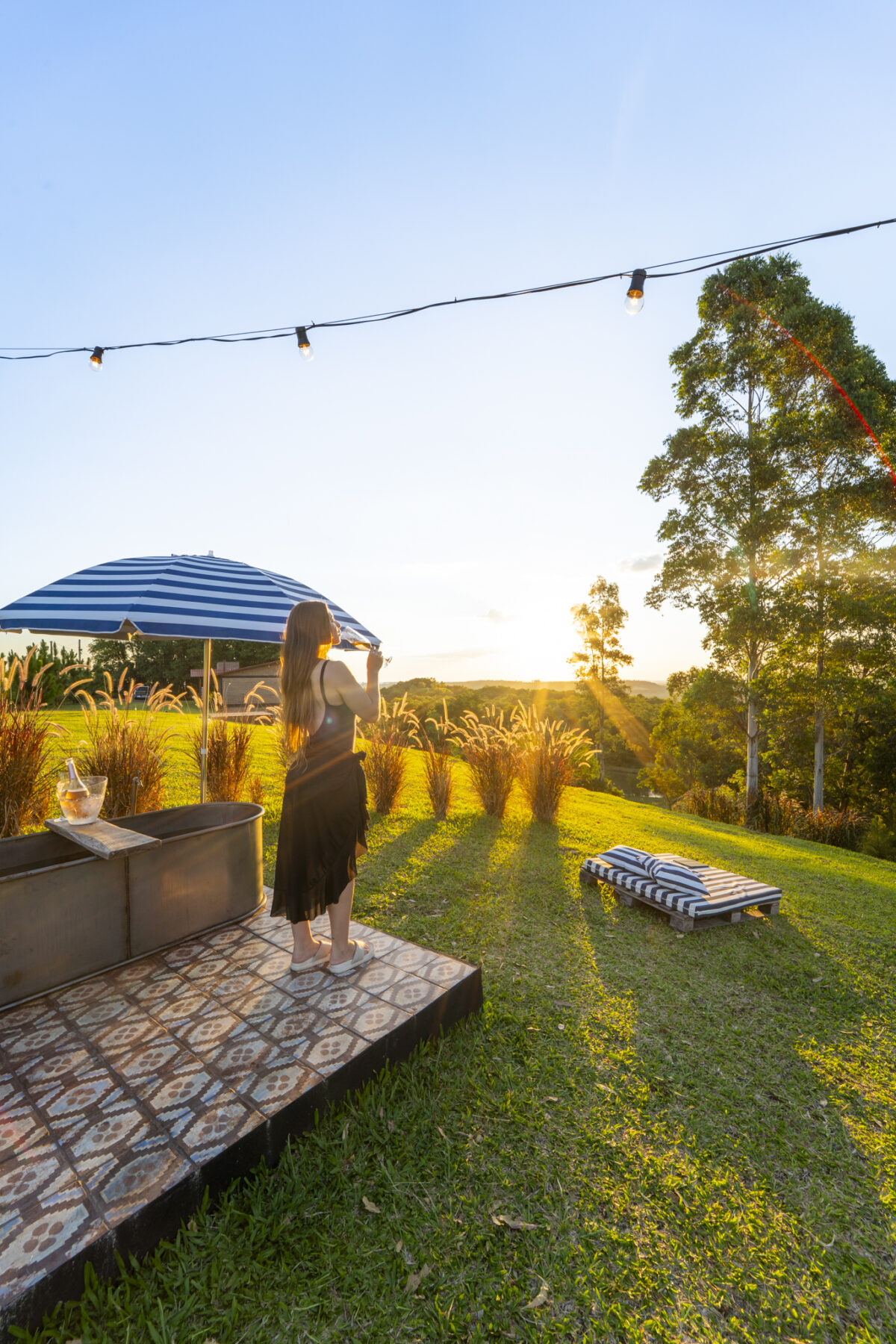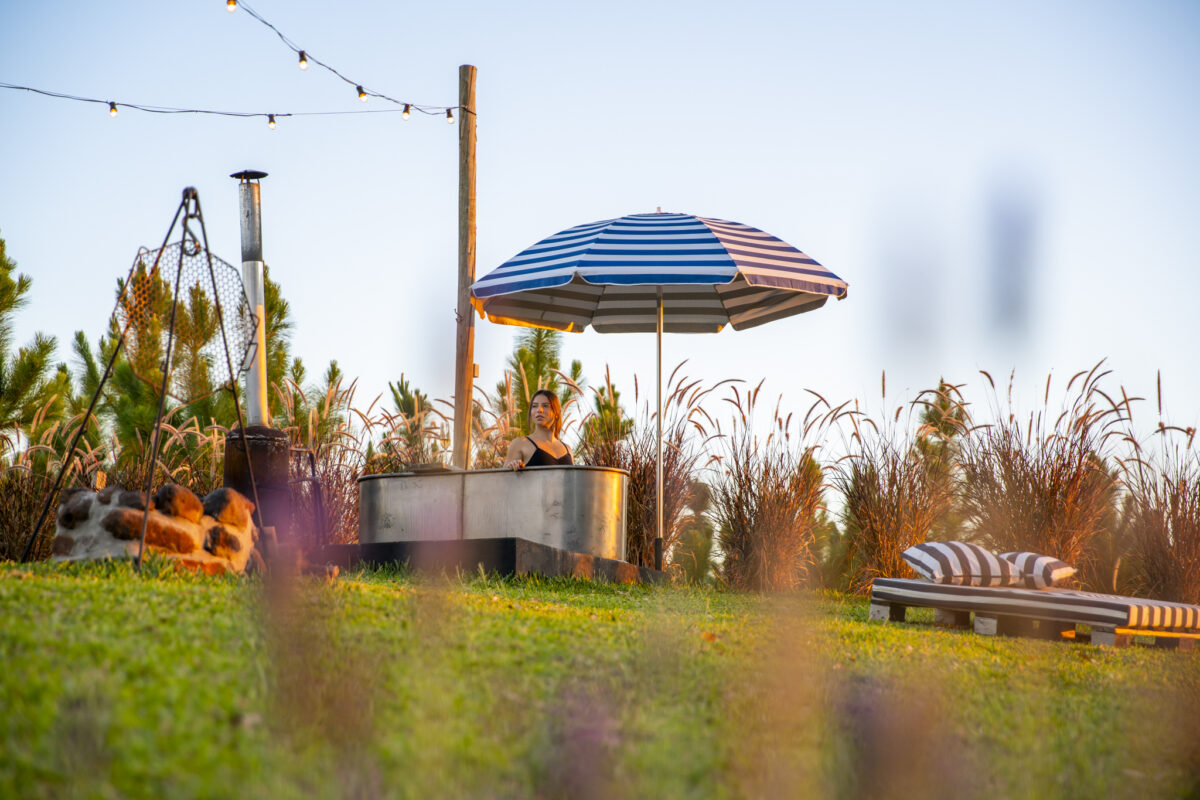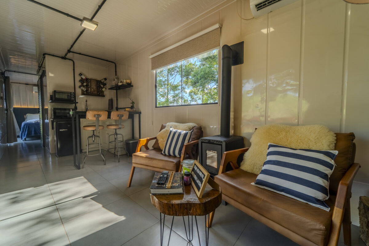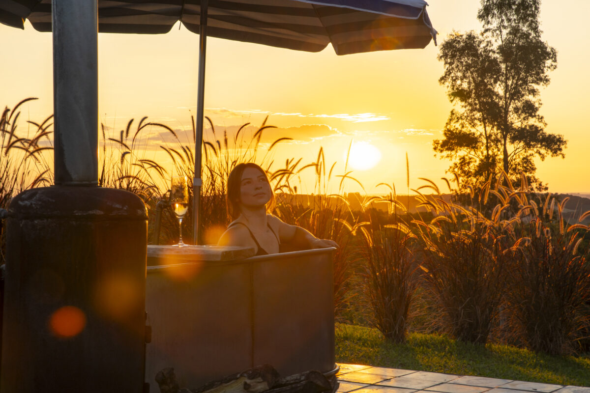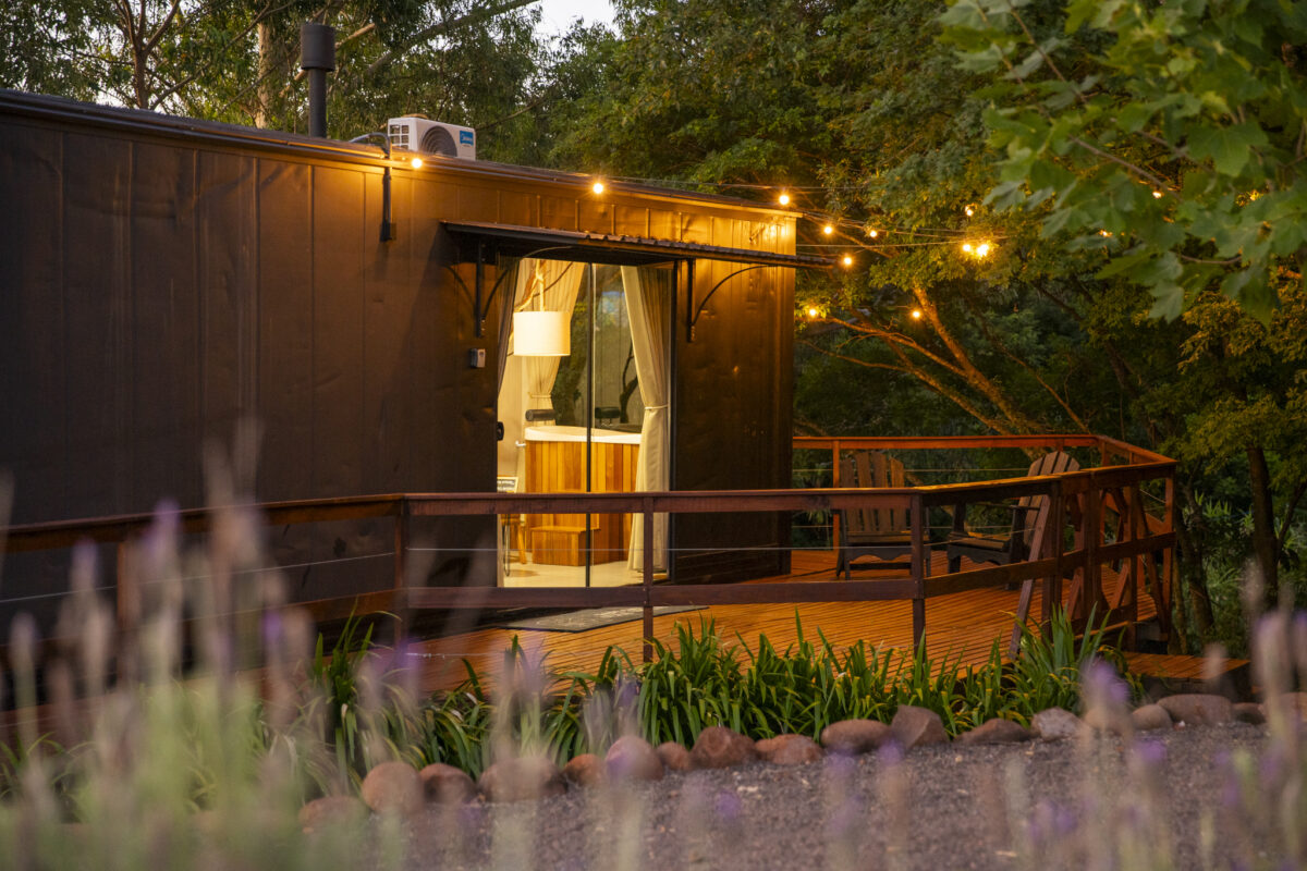 blackout e Projetor. Para maior comodidade, um banheiro completo dispondo de ducha com aquecimento à gás, toalhas e roupões, secador de cabelo e amenidades. Um charme especial da Morada Container é um cantinho dispondo de um ofurô com hidromassagem oferecendo uma vista incrível para a natureza ao redor. Além disso, uma lareira aconchegante, com poltronas confortáveis ao lado e TV Smart 32′. Na área externa, um deck de madeira com cadeiras convida você a relaxar e apreciar a vista deslumbrante do noroeste gaúcho. Além disso, um amplo gramado proporciona o ambiente ideal para um piquenique ao ar livre. Também possuímos fogo de chão com trempe campeira e a vista do pôr do sol.