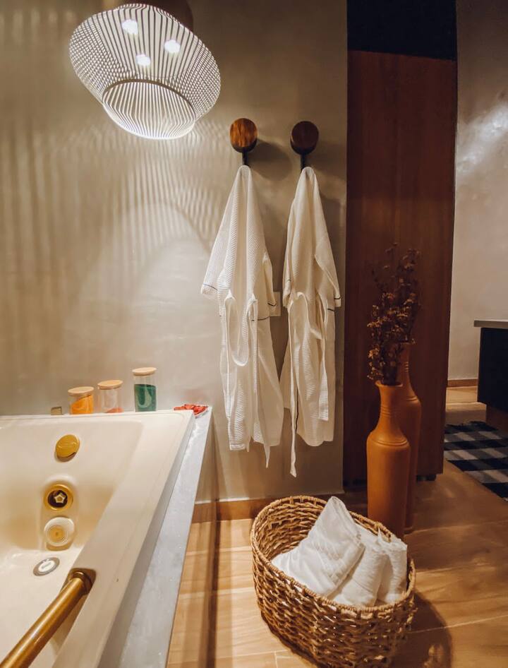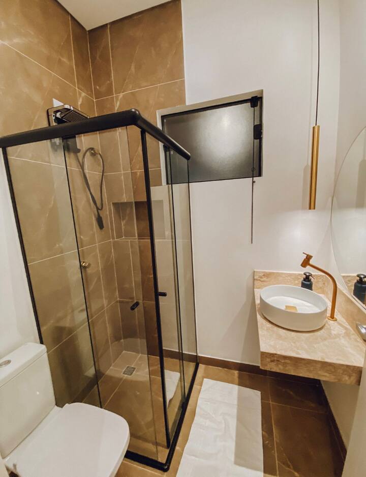 O único ponto que talvez pudesse ser adaptado, é a questão da privacidade na banheira de dentro, pois a casa fica localizada próxima do refeitório da fábrica e no caminho transitam várias pessoas que não são dos chalés.