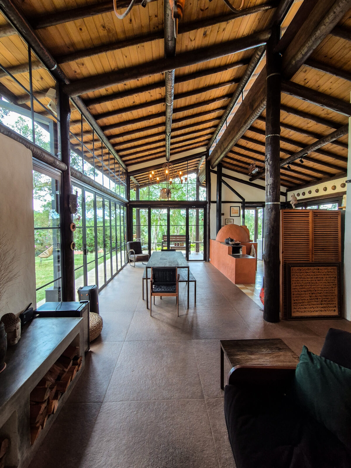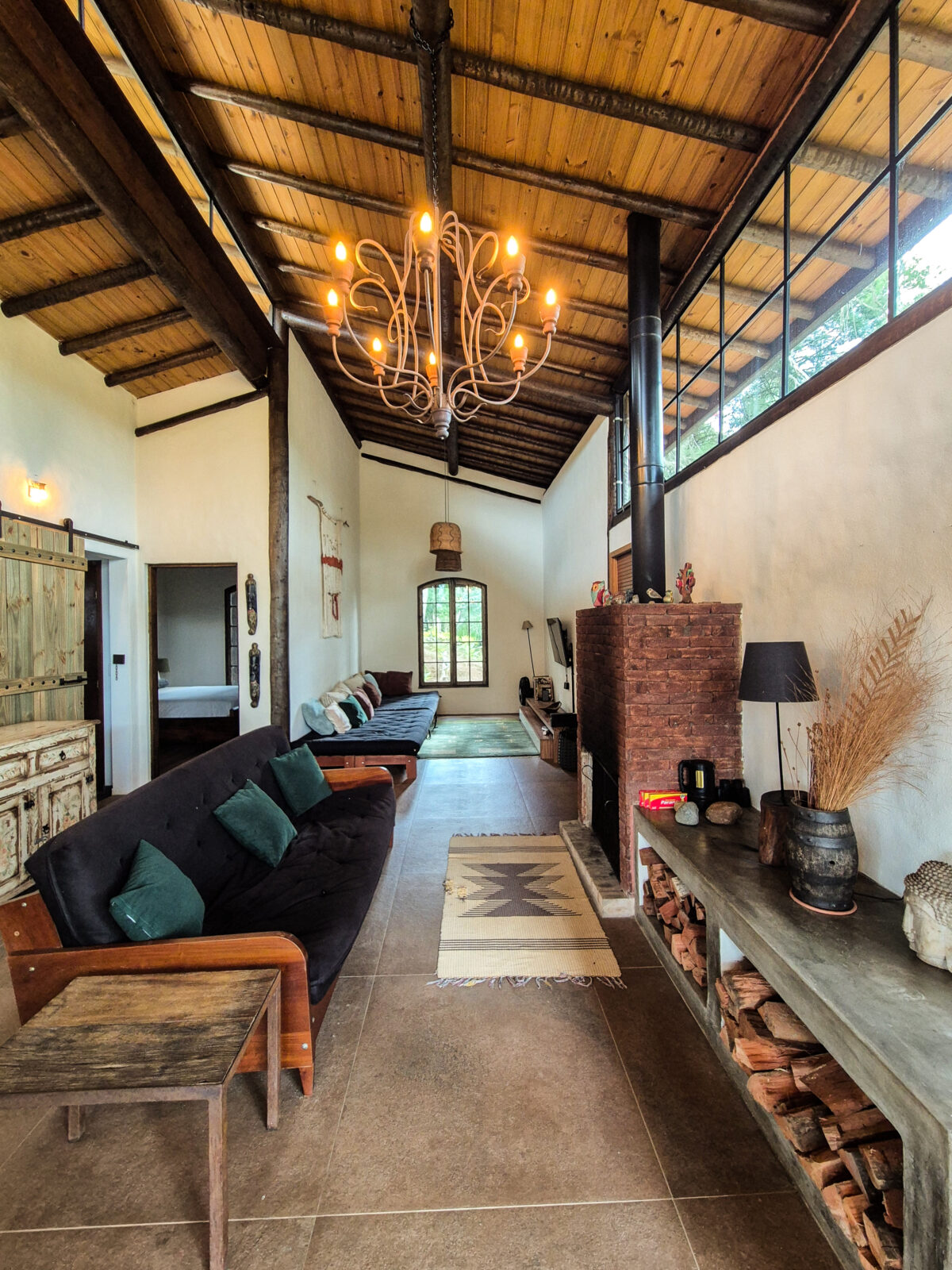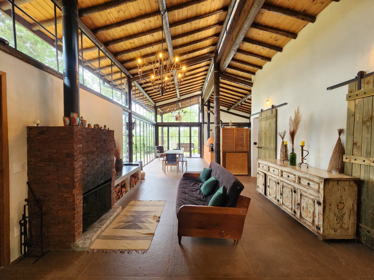 A casa sede reúne os principais espaços de convivência e foi pensada para oferecer conforto e integração. Dispondo de uma sala de estar aconchegante com sofá confortável e lareira,. Ao lado, a sala de TV dispõe de sofás, poltronas e Smart TV.