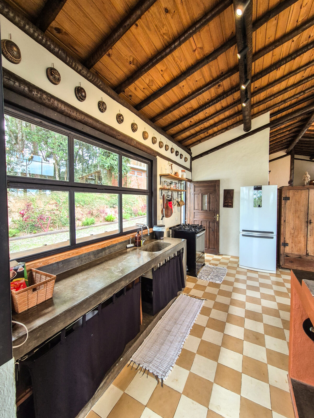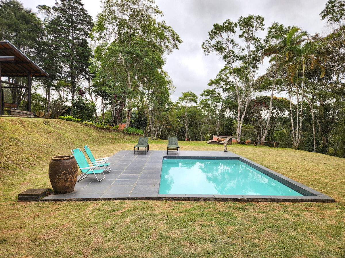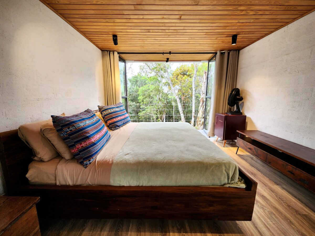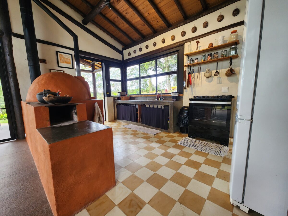 Além disso, a cozinha principal é completa e funcional, equipada com fogão, geladeira, forno e utensílios para o preparo das refeições, há também um fogão a lenha que reforça o clima acolhedor da casa na serra. Dentro da casa sede, há uma suíte com cama de casal e enxoval completo. Anexas à casa, a 50 metros de distância, ficam duas suítes externas, ambas equipadas com cama de casal.