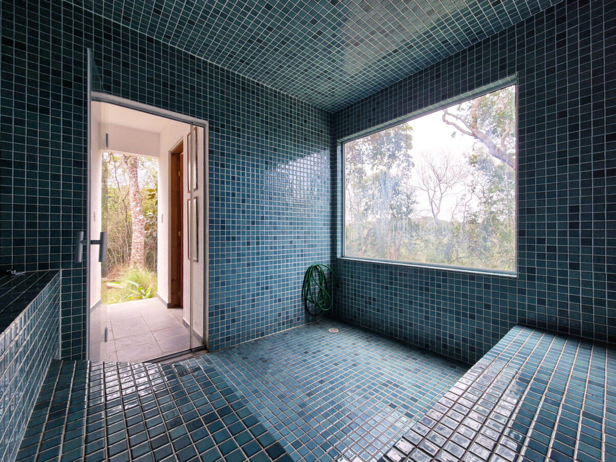 Completando a experiência, a área externa com muito contato com a natureza. O terreno é rodeado por área verde e jardim. O espaço conta com gramado amplo para atividades ao ar livre, piscina com espreguiçadeiras, área gourmet com churrasqueira, mesa e cadeiras para refeições externas, além de um espaço de firepit para fogueiras.