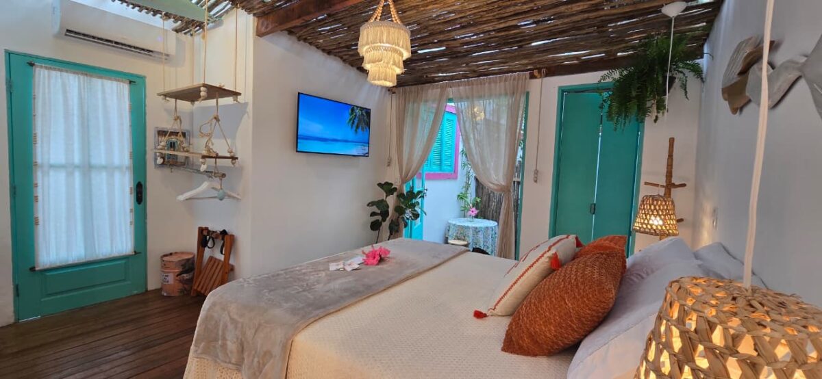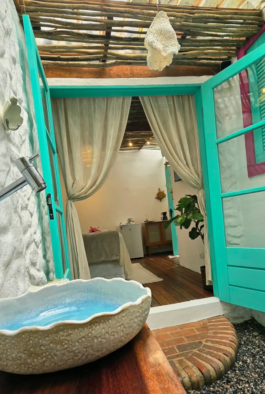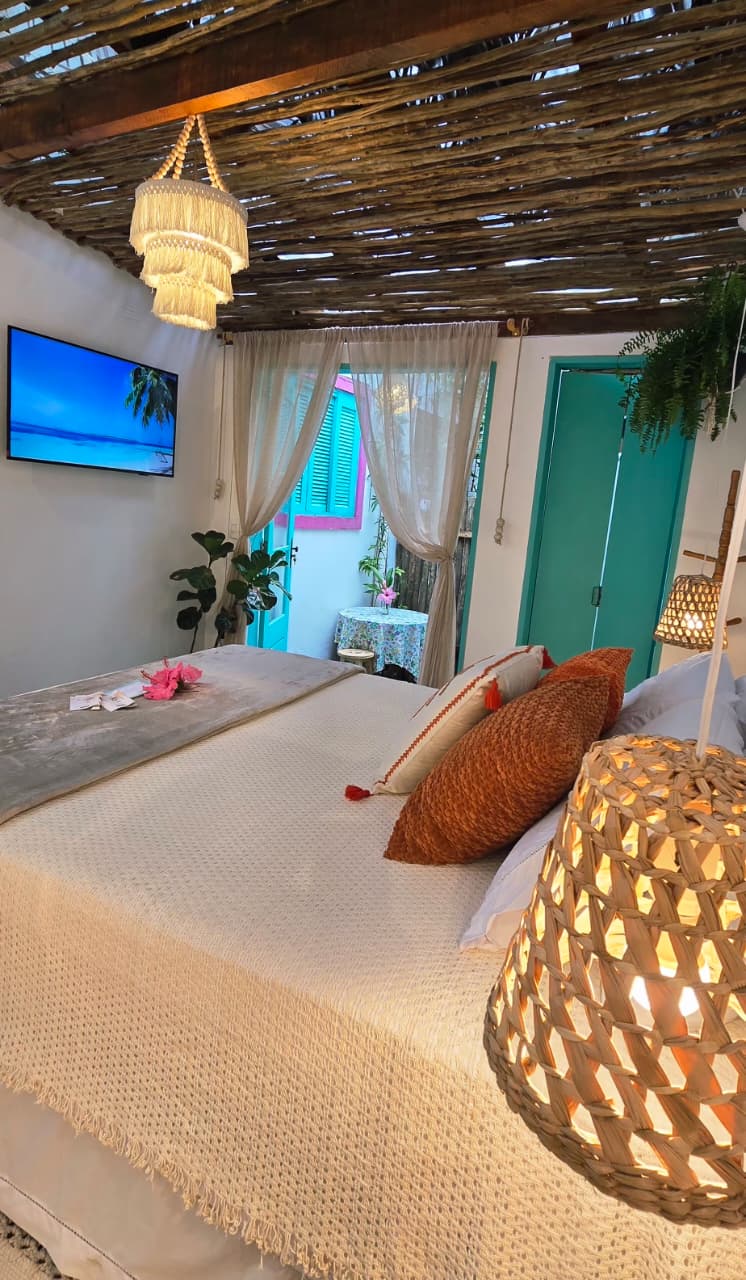 Além disso, um frigobar de apoio, chaleira elétrica e sanduicheira, trazendo praticidade para a estadia. O banheiro complementa a experiência com ducha de água quente, toalhas e amenidades. O grande charme fica por conta do teto de vidro, ideal para relaxar e desacelerar, aproveitando a luz natural e o clima leve do litoral.