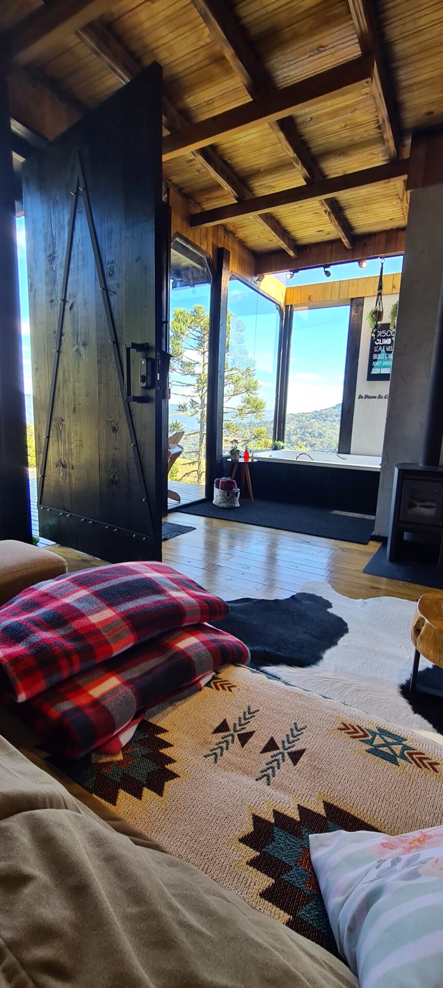 Subindo as escadas para o mezanino, o quarto principal com uma cama king size e duas de solteiro, todas com enxoval completo. O espaço conta ainda com cortinas blackout, ar-condicionado e espaço para para itens pessoais. Além disso, há uma varanda com vista privilegiada para as montanhas.