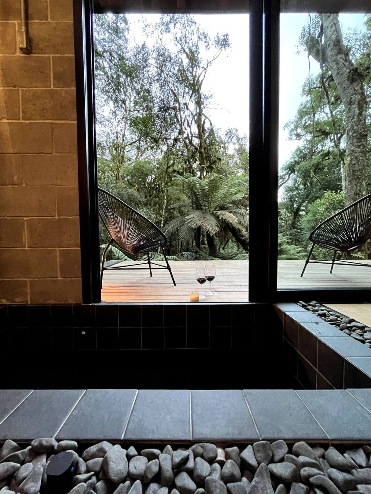queen size, calefator, sofá amplo, SmartTV 50″ giratória, ar-condicionado, banheira no estilo “Onsen”, deck com cadeiras e churrasqueira, área externa com fogueira (firepit) e uma adega no subterrâneo com seleção de vinhos exclusiva para os hóspedes.